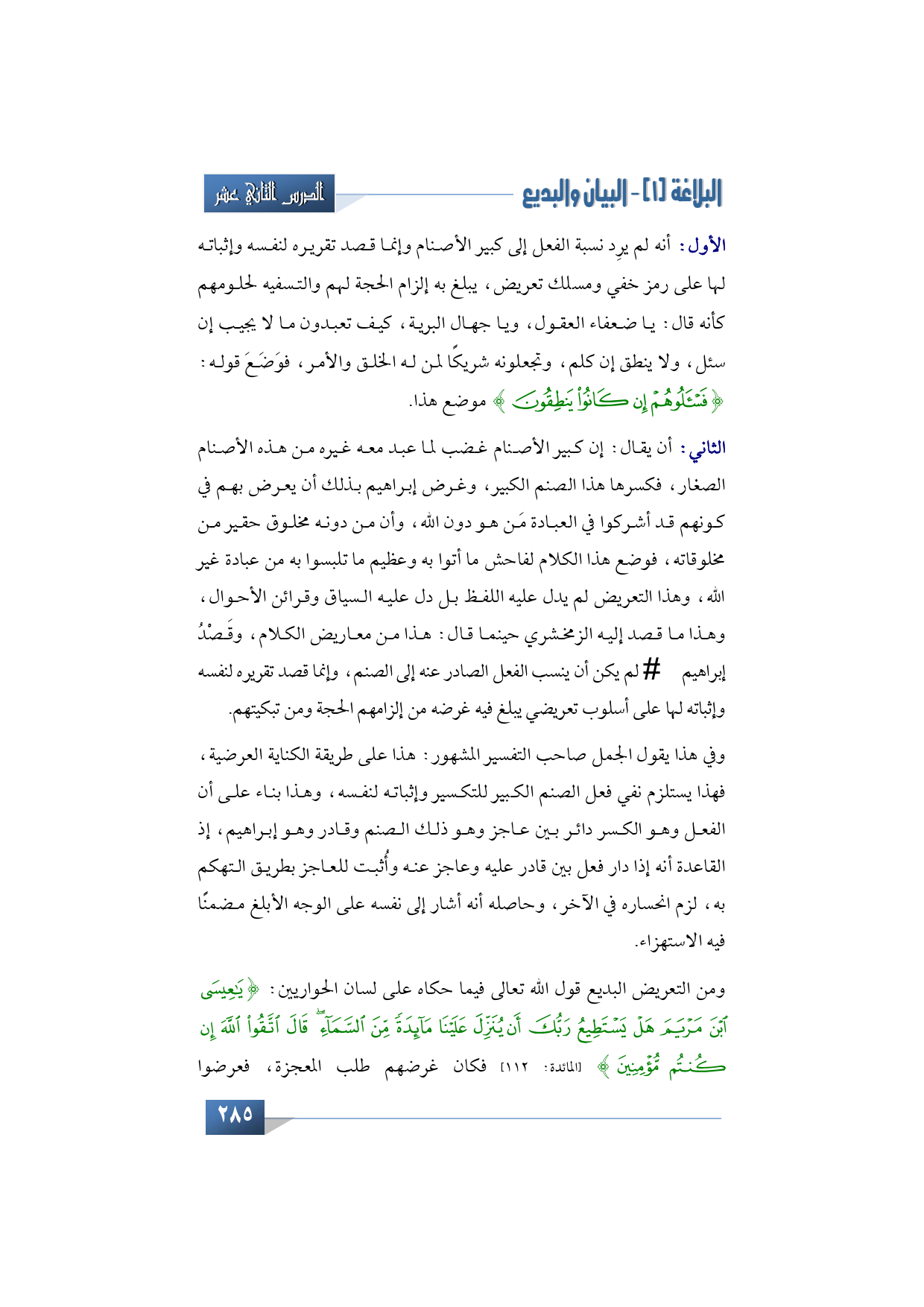 الأمر الثاني: أن يقال: أن كبير الأصنام غضب لما عبد معه غيره من هذه الأصنام الصغار، فكسرها هذا الصنم الكبير، وغرض إبراهيم بذلك أن يعرض بهم في كونهم قد أشركوا في العبادة مَن هو دون الله، وأن من دونه مخلوق حقير من مخلوقاته، فوضع هذا الكلام لفاحش ما أتوا به وعظيم ما تلبسوا به من عبادة غير الله، وهذا التعريض لم يدل عليه اللفظ بل دل عليه السياق وقرائن الأحوال، وهذا ما قصد إليه الزمخشري حينما قال: هذا من معاريض الكلام، وقَصْدُ إبراهيم -عليه السلام- لم يكن أن ينسب الفعل الصادر عنه إلى الصنم، وإنما قصد تقريره لنفسه وإثباته لها على أسلوب تعريضي يبلغ فيه غرضه من إلزامهم الحجة ومن تبكيتهم.