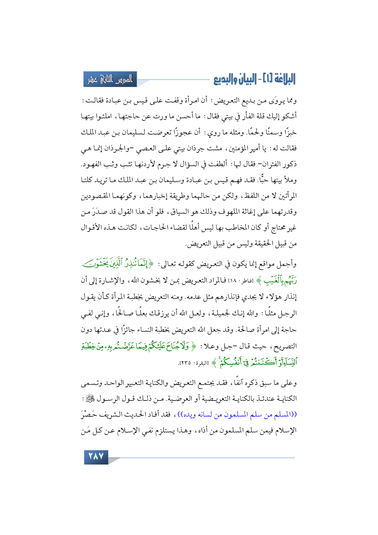 وأجمل مواقع إنما يكون في التعريض كقوله تعالى: {إِنَّمَا تُنْذِرُ الَّذِينَ يَخْشَوْنَ رَبَّهُمْ بِالْغَيْبِ} (فاطر: 18) فالمراد التعريض بمن لا يخشون الله، والإشارة إلى أن إنذار هؤلاء لا يجدي فإنذارهم مثل عدمه. ومنه التعريض بخِطبة المرأة كأن يقول الرجل مثلًا: والله إنك لجميلة، ولعل الله أن يرزقك بعلًا صالحًا، وإني لفي حاجة إلى امرأة صالحة. وقد جعل الله التعريض بخطبة النساء جائزًا في عدتها دون التصريح، حيث قال -جل وعلا-: {وَلَا جُنَاحَ عَلَيْكُمْ فِيمَا عَرَّضْتُمْ بِهِ مِنْ خِطْبَةِ النِّسَاءِ أَوْ أَكْنَنْتُمْ فِي أَنْفُسِكُمْ} (البقرة: 235).