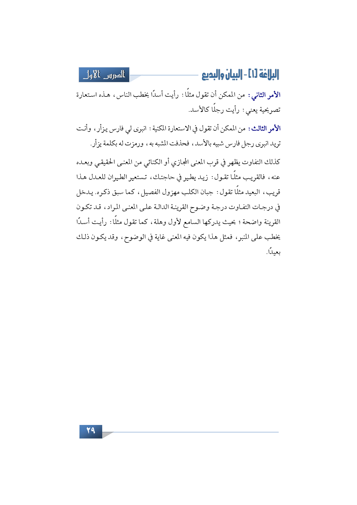 كذلك التفاوت يظهر في قرب المعنى المجازي أو الكنائي من المعنى الحقيقي وبعده عنه، فالقريب مثلًا تقول: زيد يطير في حاجتك، تستعير الطيران للعدل هذا قريب، البعيد مثلًا تقول: جبان الكلب مهزول الفصيل، كما سبق وأن ذكرت. يدخل في درجات التفاوت درجة وضوح القرينة الدالة على المعنى المراد، قد تكون القرينة واضحة؛ بحيث يدركها السامع لأول وهلة، كما تقول مثلًا: رأيت أسدًا يخطب على المنبر، فمثل هذا يكون فيه المعنى غاية في الوضوح، وقد يكون ذلك بعيدًا.