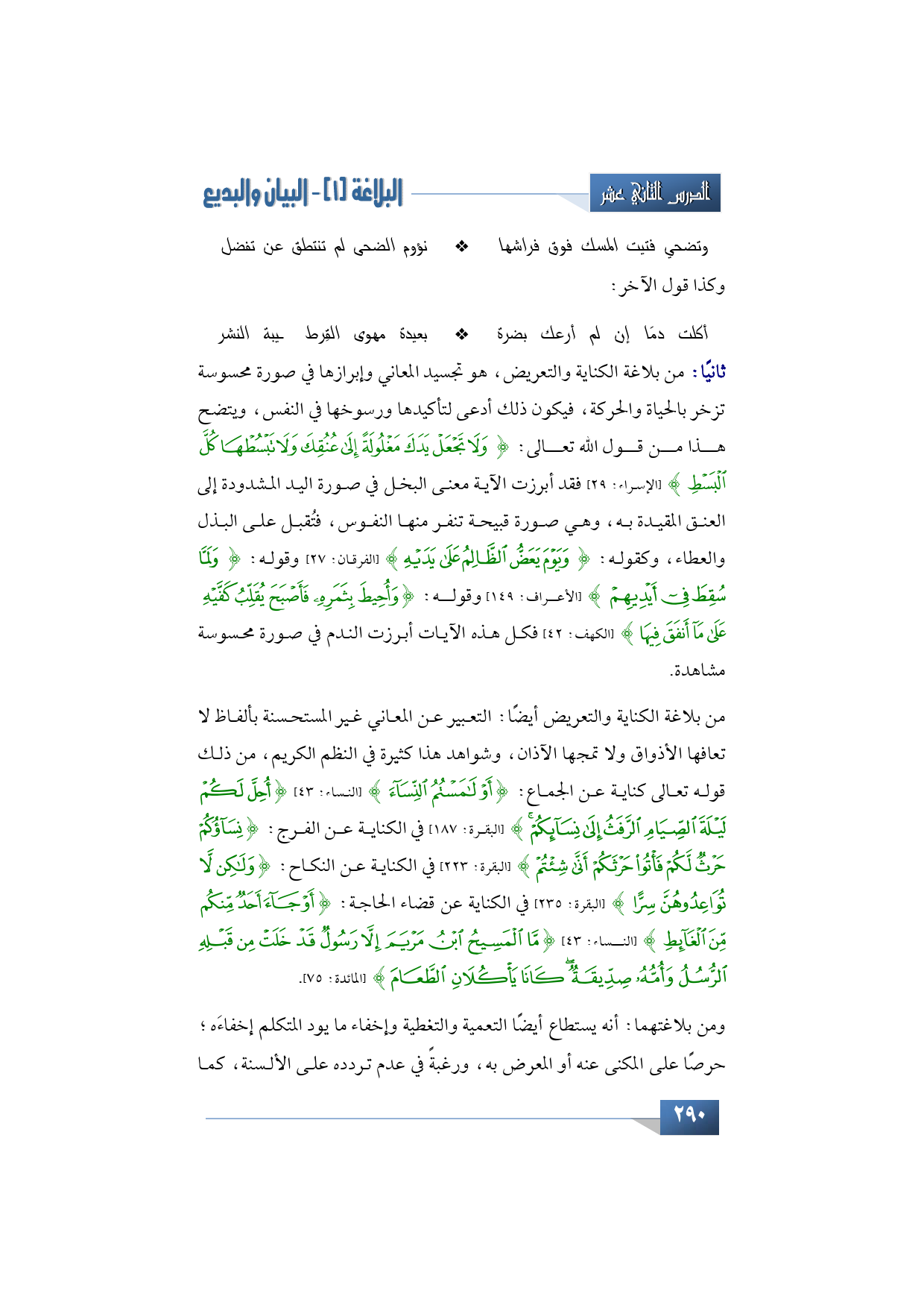 من بلاغة الكناية والتعريض أيضًا: التعبير عن المعاني غير المستحسنة بألفاظ لا تعافها الأذواق ولا تمجها الآذان، وشواهد هذا كثيرة في النظم الكريم، من ذلك قوله تعالى كناية عن الجماع: {أَوْ لَامَسْتُمُ النِّسَاءَ} (النساء: 43) {أُحِلَّ لَكُمْ لَيْلَةَ الصِّيَامِ الرَّفَثُ إِلَى نِسَائِكُمْ} (البقرة: 187) في الكناية عن الفرج: {نِسَاؤُكُمْ حَرْثٌ لَكُمْ فَأْتُوا حَرْثَكُمْ أَنَّى شِئْتُمْ} (البقرة: 223) في الكناية عن النكاح: {وَلَكِنْ لَا تُوَاعِدُوهُنَّ سِرًّا} (البقرة: 235) في الكناية عن قضاء الحاجة: {أَوْ جَاءَ أَحَدٌ مِنْكُمْ مِنَ الْغَائِطِ} (النساء: 43) {مَا الْمَسِيحُ ابْنُ مَرْيَمَ إِلَّا رَسُولٌ قَدْ خَلَتْ مِنْ قَبْلِهِ الرُّسُلُ وَأُمُّهُ صِدِّيقَةٌ كَانَا يَأْكُلَانِ الطَّعَامَ} (المائدة: 75).