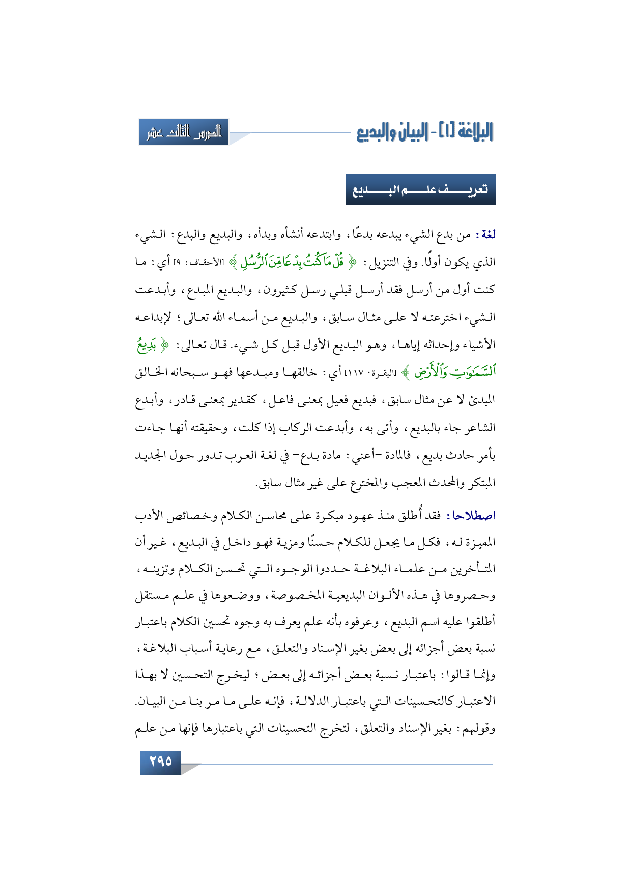 ونبدأ بتعريف "علم البديع" بكلمة "البديع" فهي في لغة العرب من بدع الشيء يبدعه بدعًا، وابتدعه أنشأه وبدأه، والبديع والبِدع: الشيء الذي يكون أولًا. وفي التنزيل: {قُلْ مَا كُنْتُ بِدْعًا مِنْ الرُّسُلِ} (الأحقاف: 9) أي: ما كنت أول من أرسل فقد أرسل قبلي رسل كثيرون، والبديع المبدع، وأبدعت الشيء اخترعته لا على مثال سابق، والبديع من أسماء الله تعالى؛ لإبداعه الأشياء وإحداثه إياها، وهو البديع الأول قبل كل شيء. قال تعالى: {بَدِيعُ السَّمَاوَاتِ وَالْأَرْضِ} (البقرة: 117) أي: خالقها ومبدعها فهو سبحانه الخالق المبدئ لا عن مثال سابق، فبديع فعيل بمعنى فاعل، كقدير بمعنى قادر، وأبدع الشاعر جاء بالبديع، وأتى به، وأبدعت الركاب إذا كلت، وحقيقته أنها جاءت بأمر حادث بديع، فالمادة -أعني: مادة بدع- في لغة العرب تدور حول الجديد المبتكر والمحدث المعجب والمخترع على غير مثال سابق.