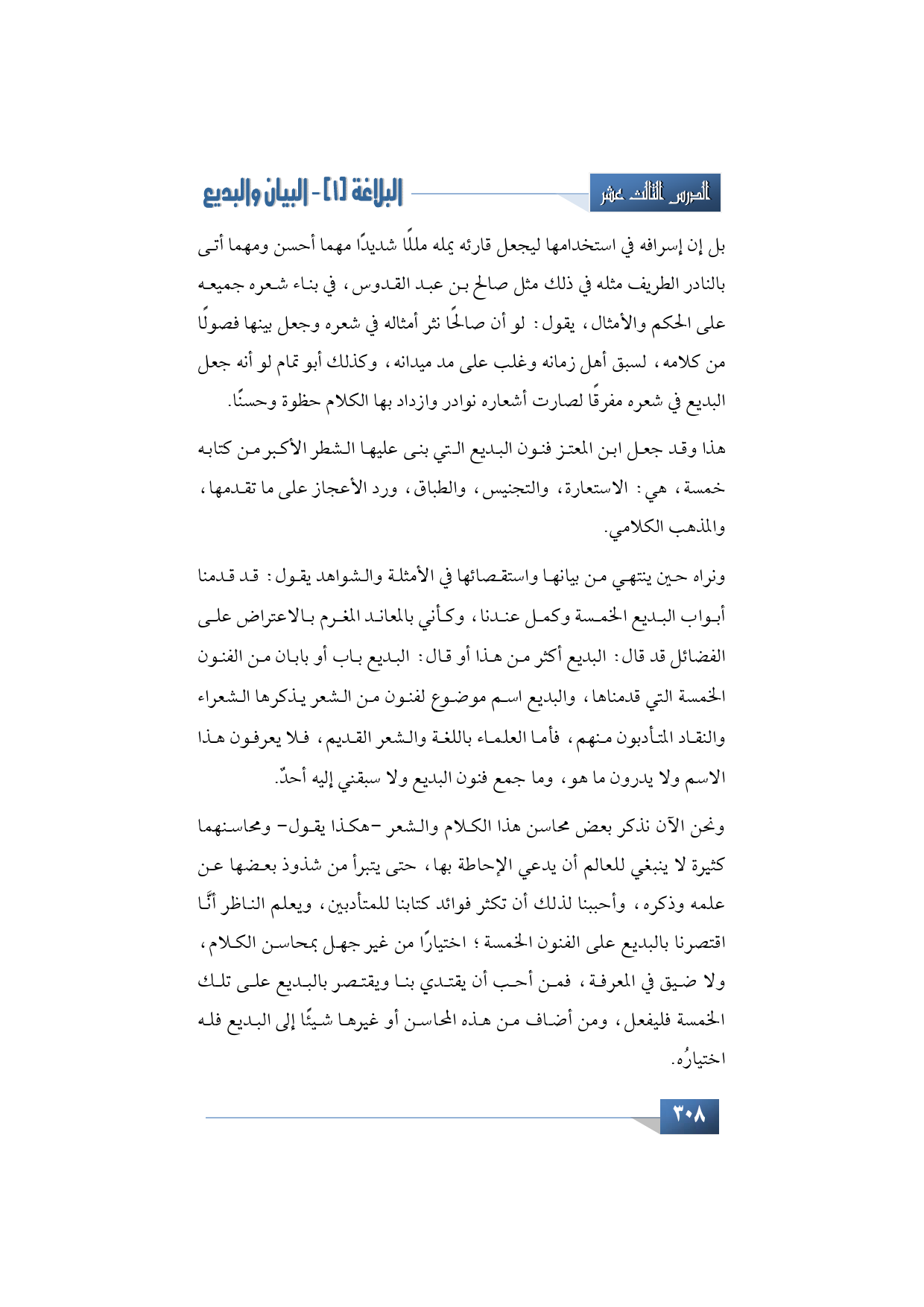 ونراه حين ينتهي من بيانها واستقصائها في الأمثلة والشواهد يقول: قد قدمنا أبواب البديع الخمسة وكمل عندنا، وكأني بالمعاند المغرم بالاعتراض على الفضائل قد قال: البديع أكثر من هذا أو قال: البديع باب أو بابان من الفنون الخمسة التي قدمناها، والبديع اسم موضوع لفنون من الشعر يذكرها الشعراء والنقاد المتأدبون منهم، فأما العلماء باللغة والشعر القديم، فلا يعرفون هذا الاسم ولا يدرون ما هو، وما جمع فنون البديع ولا سبقني إليه أحدٌ.