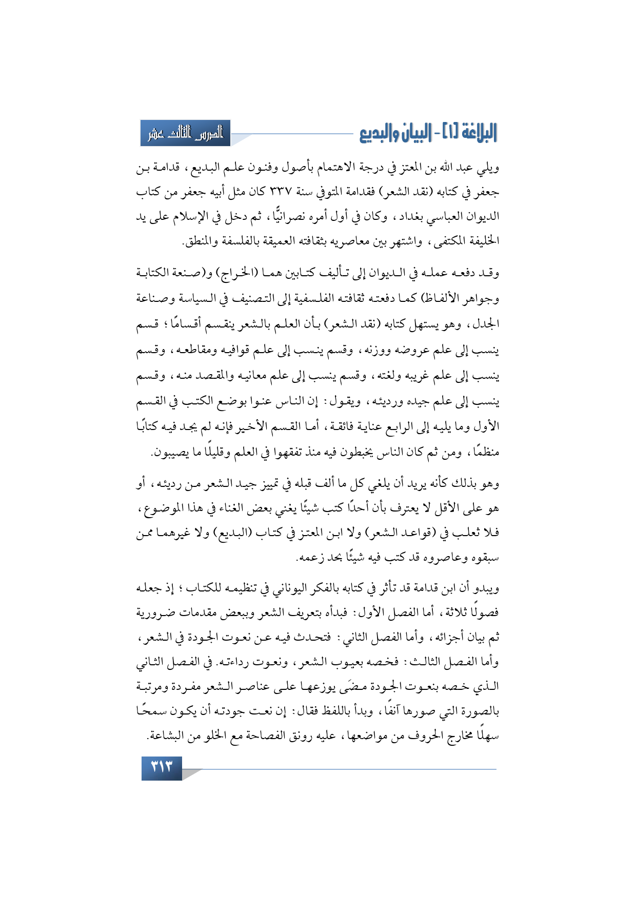 ويلي عبد الله بن المعتز في درجة الاهتمام بأصول وفنون علم البديع، قدامة بن جعفر في كتابه (نقد الشعر) فقدامة المتوفي سنة 337 كان مثل أبيه جعفر من كتاب الديوان العباسي بغداد، وكان في أول أمره نصرانيًّا، ثم دخل في الإسلام على يد الخليفة المكتفى، واشتهر بين معاصريه بثقافته العميقة بالفلسفة والمنطق.