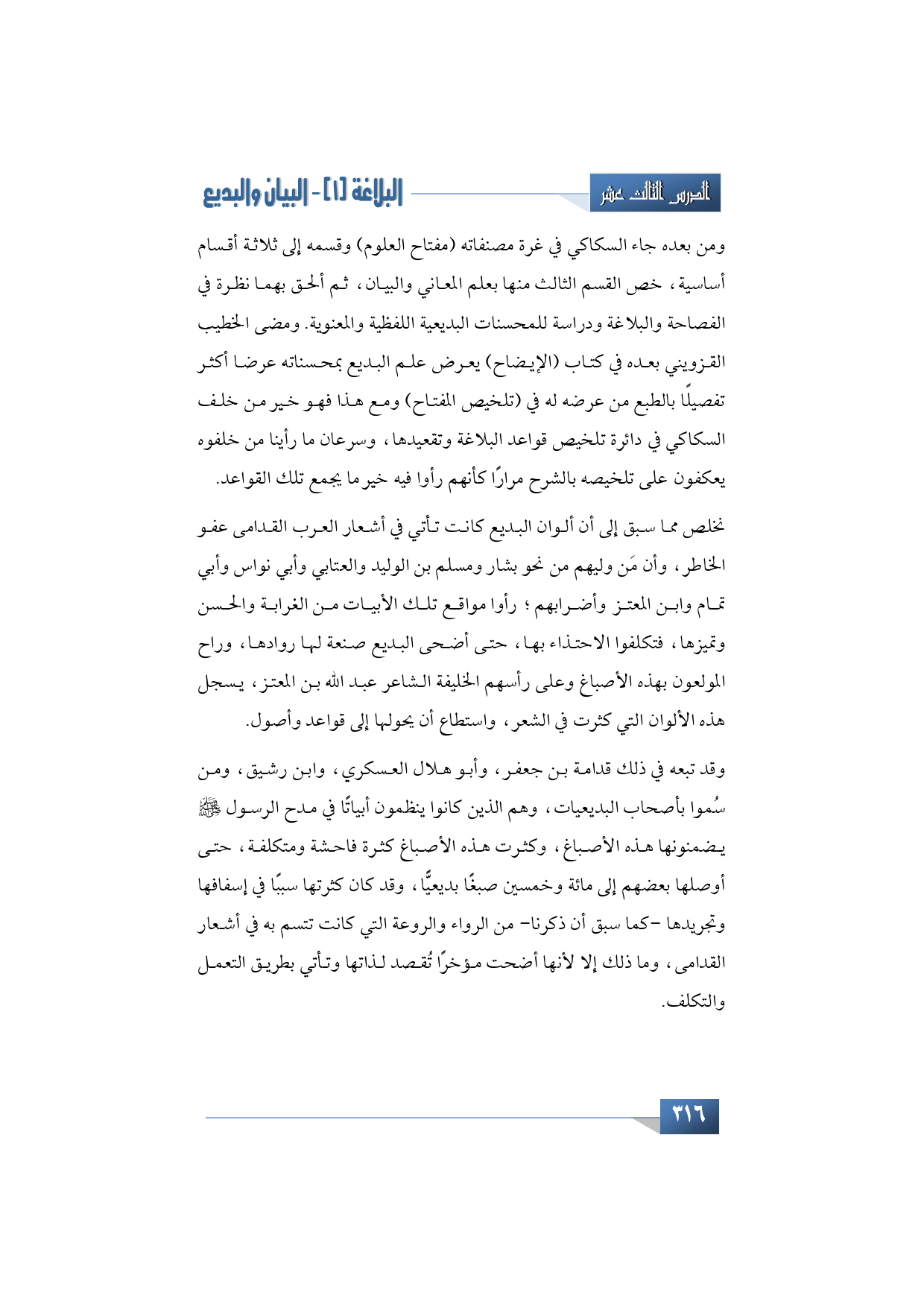 ومن بعده جاء السكاكي في غرة مصنفاته (مفتاح العلوم) وقسمه إلى ثلاثة أقسام أساسية، خص القسم الثالث منها بعلم المعاني والبيان، ثم ألحق بهما نظرة في الفصاحة والبلاغة ودراسة للمحسنات البديعية اللفظية والمعنوية. ومضى الخطيب القزويني بعده في كتاب (الإيضًاح) يعرض علم البديع بمحسناته عرضا أكثر تفصيلًا بالطبع من عرضه له في (تلخيص المفتاح) ومع هذا فهو خير من خلف السكاكي في دائرة تلخيص قواعد البلاغة وتقعيدها، وسرعان ما رأينا من خلفوه يعكفون على تلخيصه بالشرح مرارًا كأنهم رأوا فيه خير ما يجمع تلك القواعد.