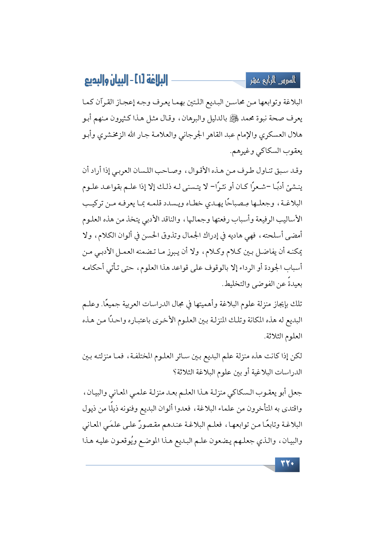 تلك بإيجاز منزلة علوم البلاغة وأهميتها في مجال الدراسات العربية جميعًا. وعلم البديع له هذه المكانة وتلك المنزلة بين العلوم الأخرى باعتباره واحدًا من هذه العلوم الثلاثة.