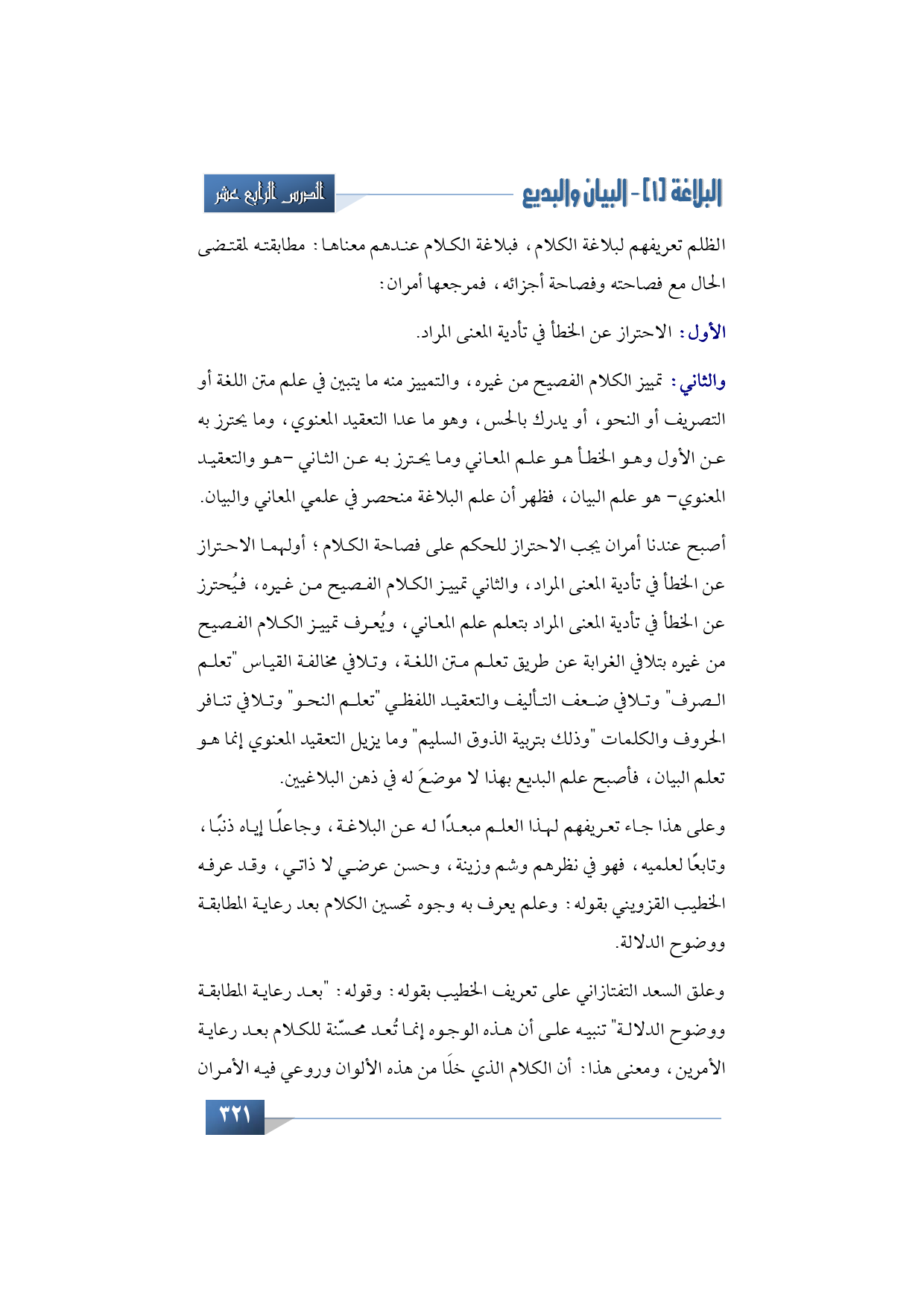 الأول: الاحتراز عن الخطأ في تأدية المعنى المراد.