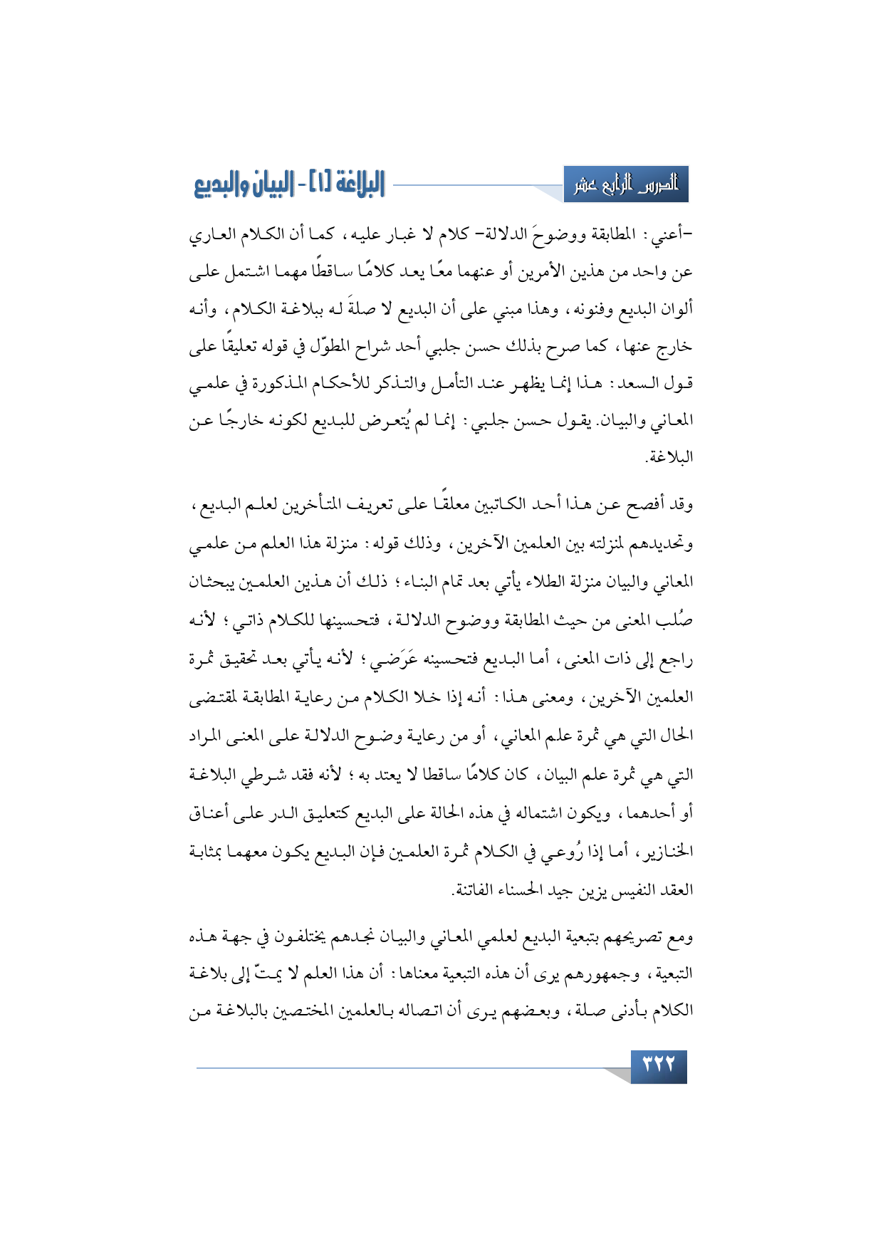 وقد أفصح عن هذا أحد الكاتبين معلقًا على تعريف المتأخرين لعلم البديع، وتحديدهم لمنزلته بين العلمين الآخرين، وذلك قوله: منزلة هذا العلم من علمي المعاني والبيان منزلة الطلاء يأتي بعد تمام البناء؛ ذلك أن هذين العلمين يبحثان صُلب المعنى من حيث المطابقة ووضوح الدلالة، فتحسينها للكلام ذاتي؛ لأنه راجع إلى ذات المعنى، أما البديع فتحسينه عَرَضي؛ لأنه يأتي بعد تحقيق ثمرة العلمين الآخرين، ومعنى هذا: أنه إذا خلا الكلام من رعاية المطابقة لمقتضى الحال التي هي ثمرة علم المعاني، أو من رعاية وضوح الدلالة على المعنى المراد التي هي ثمرة علم البيان، كان كلامًا ساقطا لا يعتد به؛ لأنه فقد شرطي البلاغة أو أحدهما، ويكون اشتماله في هذه الحالة على البديع كتعليق الدر على أعناق الخنازير، أما إذا رُوعي في الكلام ثمرة العلمين فإن البديع يكون معهما بمثابة العقد النفيس يزين جيد الحسناء الفاتنة.