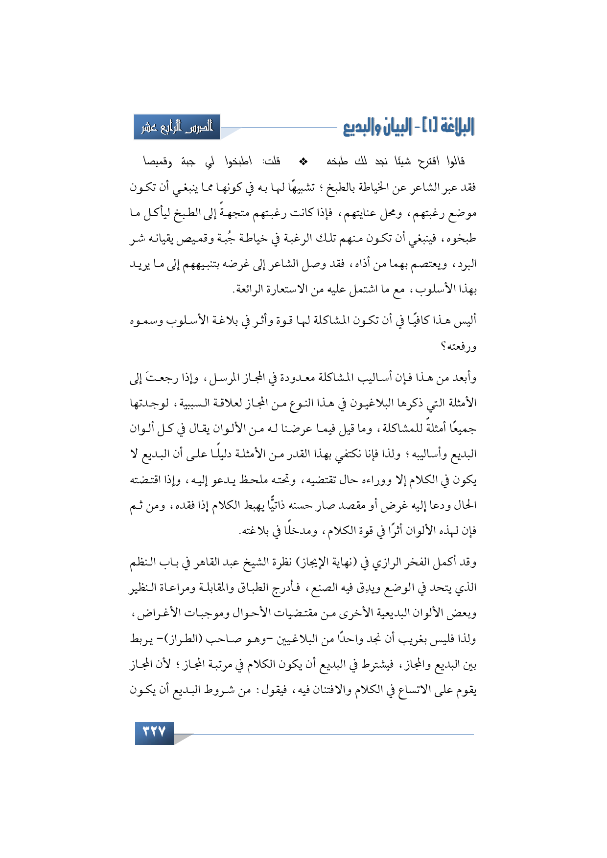 وقد أكمل الفخر الرازي في (نهاية الإيجاز) نظرة الشيخ عبد القاهر في باب النظم الذي يتحد في الوضع ويدِق فيه الصنع، فأدرج الطباق والمقابلة ومراعاة النظير وبعض الألوان البديعية الأخرى من مقتضيات الأحوال وموجبات الأغراض، ولذا فليس بغريب أن نجد واحدًا من البلاغيين -وهو صاحب (الطراز) - يربط بين البديع والمجاز، فيشترط في البديع أن يكون الكلام في مرتبة المجاز؛ لأن المجاز يقوم على الاتساع في الكلام والافتنان فيه، فيقول: من شروط البديع أن يكون