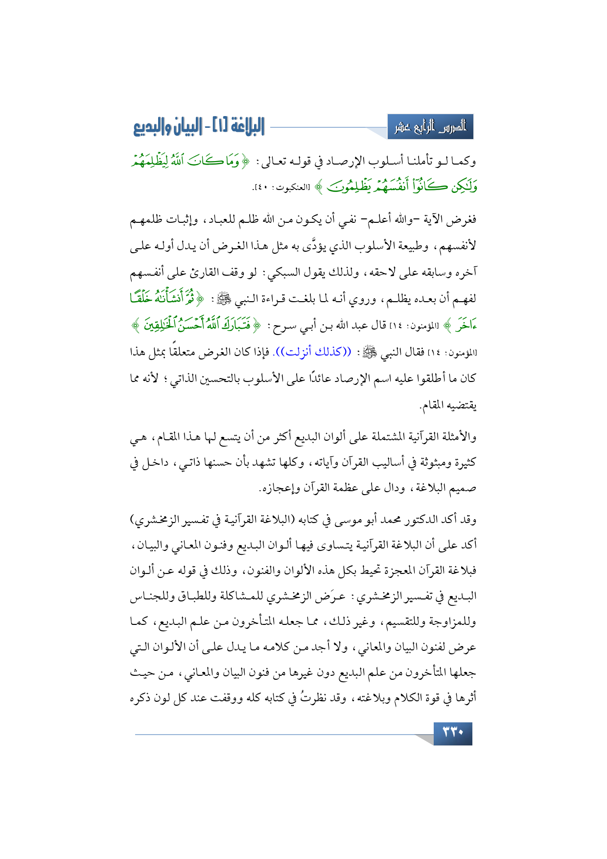 وقد أكد الدكتور محمد أبو موسى في كتابه (البلاغة القرآنية في تفسير الزمخشري) أكد على أن البلاغة القرآنية يتساوى فيها ألوان البديع وفنون المعاني والبيان، فبلاغة القرآن المعجزة تحيط بكل هذه الألوان والفنون، وذلك في قوله عن ألوان البديع في تفسير الزمخشري: عرَض الزمخشري للمشاكلة وللطباق وللجناس وللمزاوجة وللتقسيم، وغير ذلك، مما جعله المتأخرون من علم البديع، كما عرض لفنون البيان والمعاني، ولا أجد من كلامه ما يدل على أن الألوان التي جعلها المتأخرون من علم البديع دون غيرها من فنون البيان والمعاني، من حيث أثرها في قوة الكلام وبلاغته، وقد نظرتُ في كتابه كله ووقفت عند كل لون ذكره