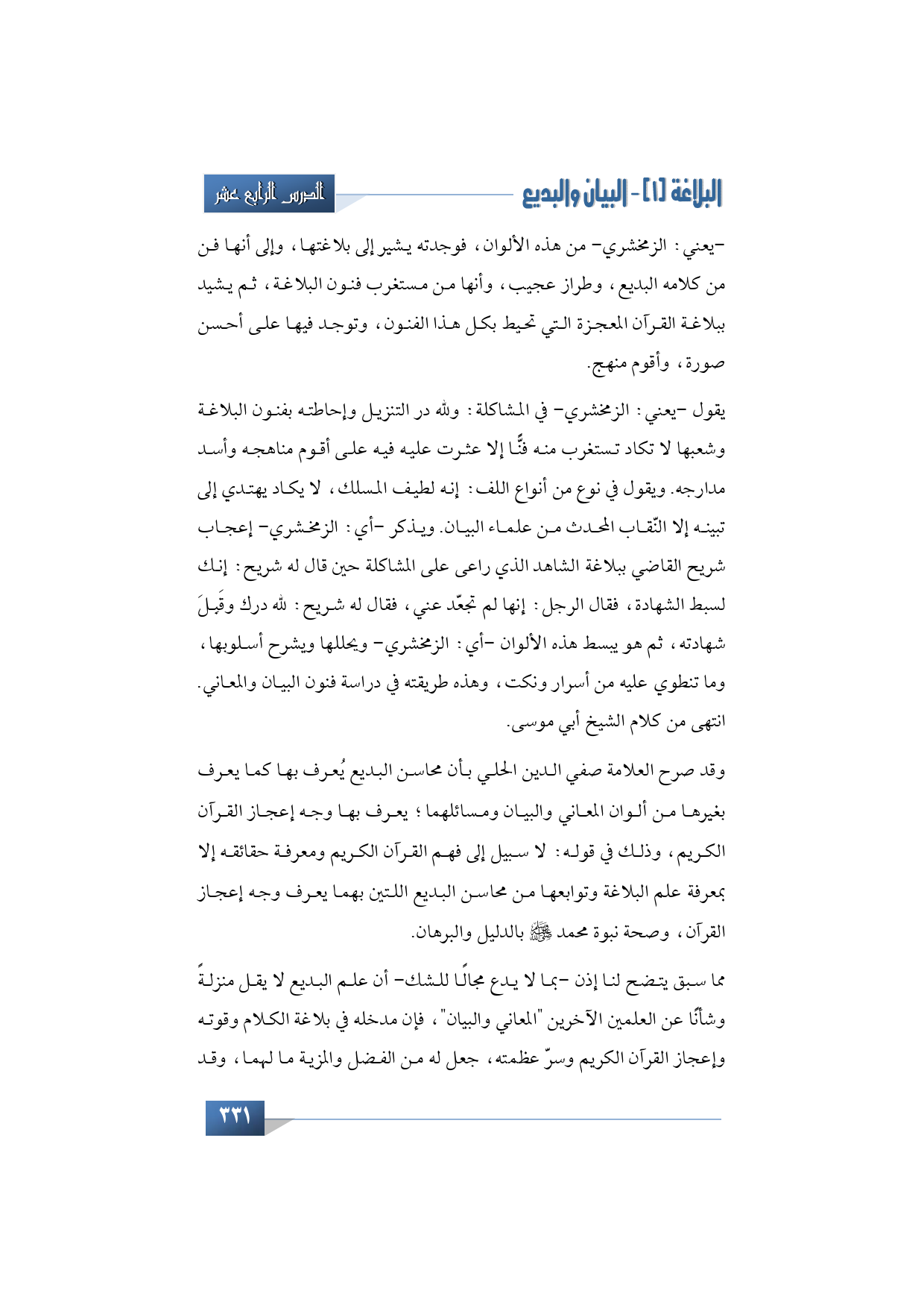 -يعني: الزمخشري- من هذه الألوان، فوجدته يشير إلى بلاغتها، وإلى أنها فن من كلامه البديع، وطراز عجيب، وأنها من مستغرب فنون البلاغة، ثم يشيد ببلاغة القرآن المعجزة التي تحيط بكل هذا الفنون، وتوجد فيها على أحسن صورة، وأقوم منهج.