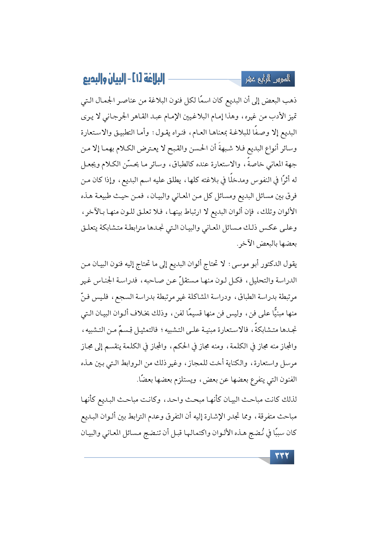 يقول الدكتور أبو موسى: لا تحتاج ألوان البديع إلى ما تحتاج إليه فنون البيان من الدراسة والتحليل، فكل لون منها مستقلّ عن صاحبه، فدراسة الجناس غير مرتبطة بدراسة الطباق، ودراسة المشاكلة غير مرتبطة بدراسة السجع، فليس فنّ منها مبنيًّا على فن، وليس فن منها قسيمًا لفن، وذلك بخلاف ألوان البيان التي نجدها متشابكةً، فالاستعارة مبنية على التشبيه؛ فالتمثيل قِسمٌ من التشبيه، والمجاز منه مجاز في الكلمة، ومنه مجاز في الحكم، والمجاز في الكلمة ينقسم إلى مجاز مرسل واستعارة، والكناية أخت للمجاز، وغير ذلك من الروابط التي بين هذه الفنون التي يتفرع بعضها عن بعض، ويستلزم بعضها بعضًا.