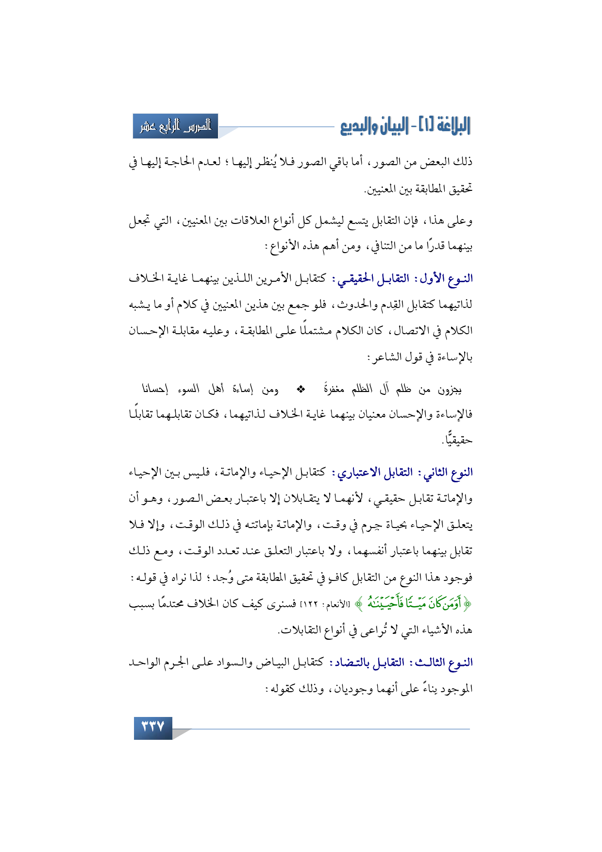 النوع الثاني من التقابل: التقابل الاعتباري: كتقابل الإحياء والإماتة، فليس بين الإحياء والإماتة تقابل حقيقي، لأنهما لا يتقابلان إلا باعتبار بعض الصور، وهو أن يتعلق الإحياء بحياة جِرم في وقت، والإماتة بإماتته في ذلك الوقت، وإلا فلا تقابل بينهما باعتبار أنفسهما، ولا باعتبار التعلق عند تعدد الوقت، ومع ذلك فوجود هذا النوع من التقابل كافٍ في تحقيق المطابقة متى وُجد؛ لذا نراه في قوله: {أَوَ مَن كَانَ مَيْتًا فَأَحْيَيْنَاهُ} (الأنعام: 122) فسنرى كيف كان الخلاف محتدمًا بسبب هذه الأشياء التي لا تُراعى في أنواع التقابلات.