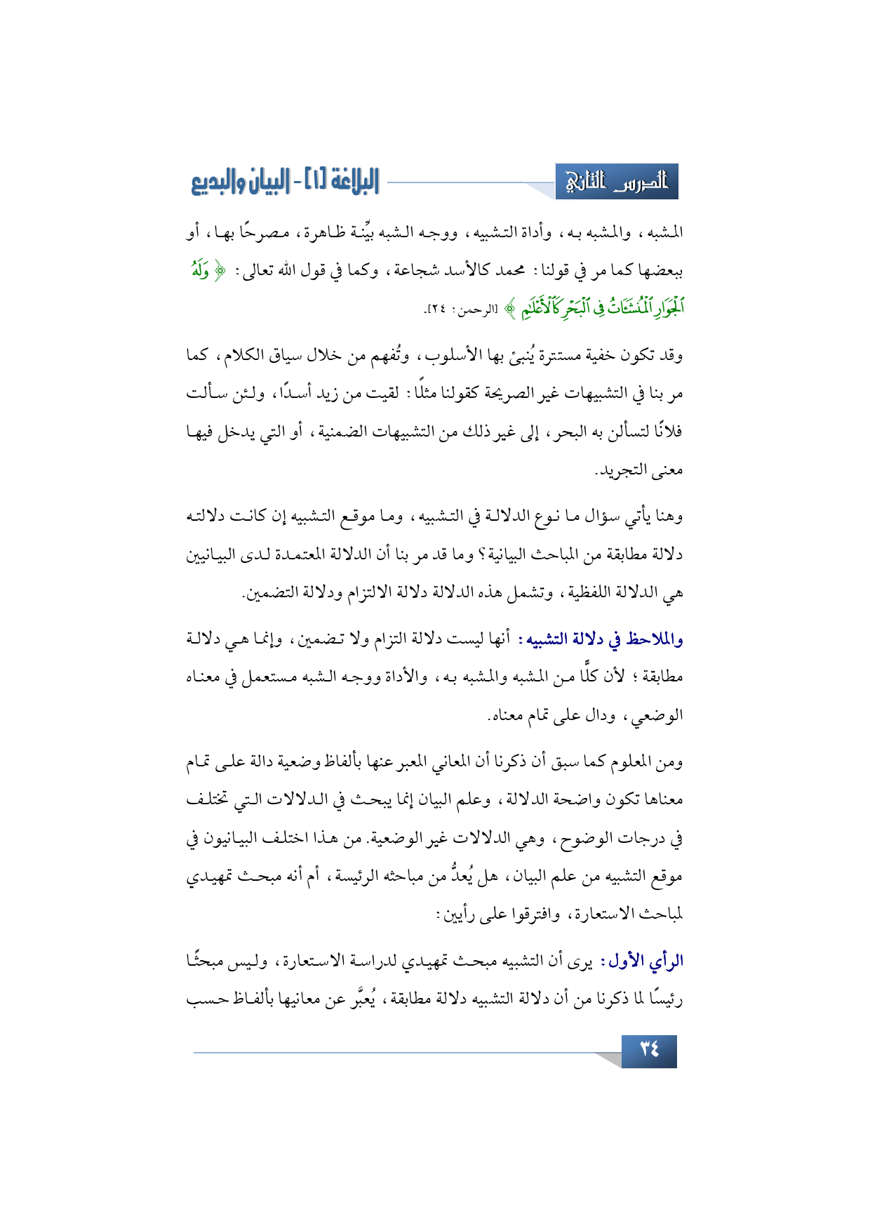 رأي يرى أن التشبيه مبحث تمهيدي لدراسة الاستعارة، وليس مبحثًا رئيسًا لما ذكرنا من أن دلالة التشبيه دلالة مطابقة، يُعبَّر عن معانيها بألفاظ حسب