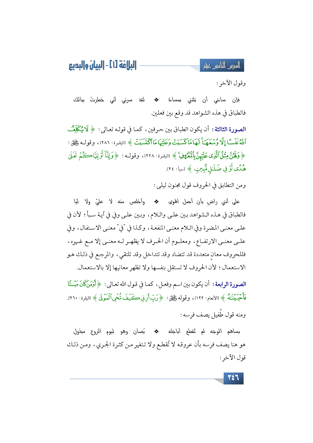 الصورة الثالثة: أن يكون الطباق بين حرفين، كما في قوله تعالى: {لَا يُكَلِّفُ اللَّهُ نَفْسًا إِلَّا وُسْعَهَا لَهَا مَا كَسَبَتْ وَعَلَيْهَا مَا اكْتَسَبَت} (البقرة: 286)، وقوله -عز وجل-: {وَلَهُنَّ مِثْلُ الَّذِي عَلَيْهِنَّ بِالْمَعْرُوف} (البقرة: 228)، وقوله: {وَإِنَّا أَوْ إِيَّاكُمْ لَعَلَى هُدًى أَوْ فِي ضَلَالٍ مُبِينٍ} (سبأ: 24).