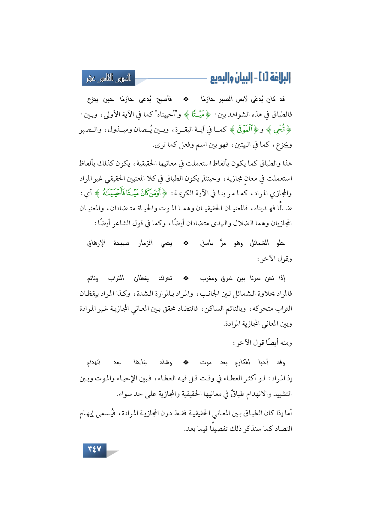 هذا والطباق كما يكون بألفاظ استعملت في معانيها الحقيقية، يكون كذلك بألفاظ استعملت في معانٍ مجازية، وحينئذٍ يكون الطباق في كلا المعنيين الحقيقي غير المراد والمجازي المراد، كما مر بنا في الآية الكريمة: {أَوَمَنْ كَانَ مَيْتًا فَأَحْيَيْنَاهُ} أي: ضالًّا فهديناه، فالمعنيان الحقيقيان وهما الموت والحياة متضادان، والمعنيان المجازيان وهما الضلال والهدى متضادان أيضًا، وكما في قول الشاعر أيضًا: