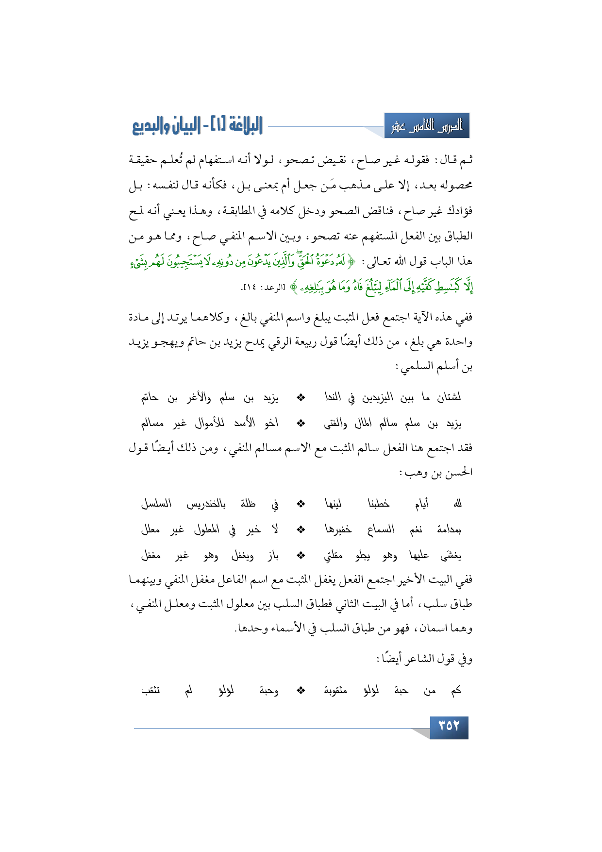 ثم قال: فقوله غير صاح، نقيض تصحو، لولا أنه استفهام لم تُعلم حقيقة محصوله بعد، إلا على مذهب مَن جعل أم بمعنى بل، فكأنه قال لنفسه: بل فؤادك غير صاح، فناقض الصحو ودخل كلامه في المطابقة، وهذا يعني أنه لمح الطباق بين الفعل المستفهم عنه تصحو، وبين الاسم المنفي صاح، ومما هو من هذا الباب قول الله تعالى: {لَهُ دَعْوَةُ الْحَقِّ وَالَّذِينَ يَدْعُونَ مِنْ دُونِهِ لَا يَسْتَجِيبُونَ لَهُمْ بِشَيْءٍ إِلَّا كَبَاسِطِ كَفَّيْهِ إِلَى الْمَاءِ لِيَبْلُغَ فَاهُ وَمَا هُوَ بِبَالِغِهِ} (الرعد: 14).