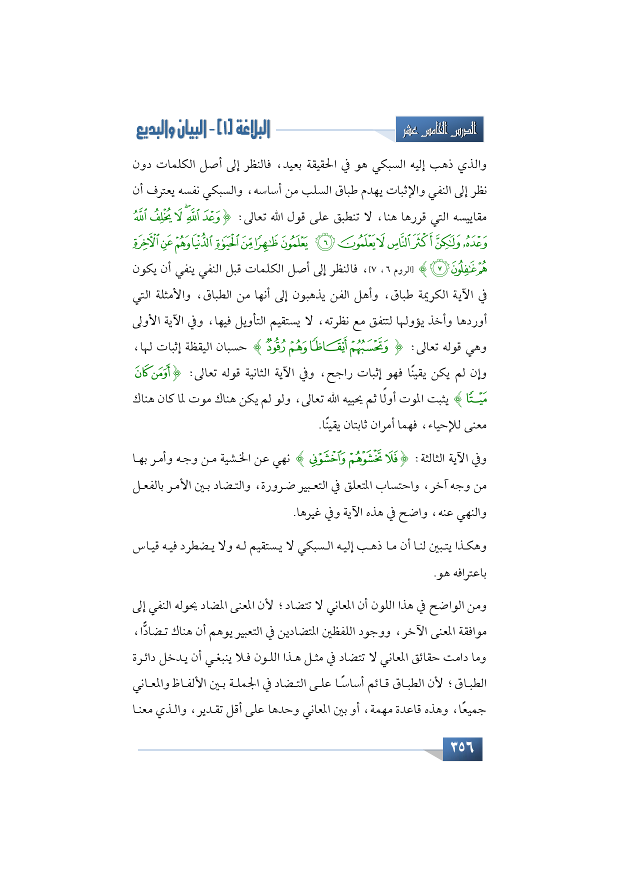والذي ذهب إليه السبكي هو في الحقيقة بعيد، فالنظر إلى أصل الكلمات دون نظر إلى النفي والإثبات يهدم طباق السلب من أساسه، والسبكي نفسه يعترف أن مقاييسه التي قررها هنا، لا تنطبق على قول الله تعالى: {وَلَكِنَّ أَكْثَرَ النَّاسِ لَا يَعْلَمُونَ * يَعْلَمُونَ ظَاهِرًا مِنَ الْحَيَاةِ الدُّنْيَا} (الروم 6، 7)، فالنظر إلى أصل الكلمات قبل النفي ينفي أن يكون في الآية الكريمة طباق، وأهل الفن يذهبون إلى أنها من الطباق، والأمثلة التي أوردها وأخذ يؤولها لتتفق مع نظرته، لا يستقيم التأويل فيها، وفي الآية الأولى وهي قوله تعالى: {وَتَحْسَبُهُمْ أَيْقَاظًا وَهُمْ رُقُود} حسبان اليقظة إثبات لها، وإن لم يكن يقينًا فهو إثبات راجح، وفي الآية الثانية قوله تعالى: {أَوَمَنْ كَانَ مَيْتًا} يثبت الموت أولًا ثم يحييه الله تعالى، ولو لم يكن هناك موت لما كان هناك معنى للإحياء، فهما أمران ثابتان يقينًا.