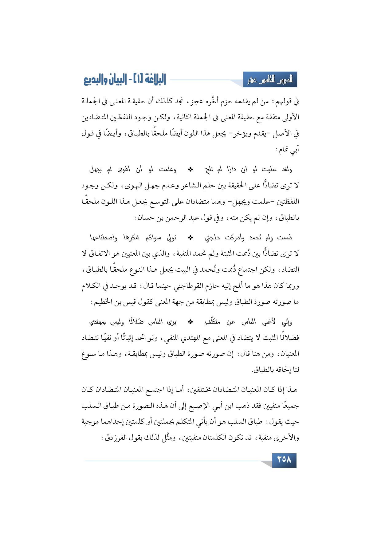 فضلالًا المثبت لا يتضاد في المعنى مع المهتدي المنفي، ولو اتحد إثباتًا أو نفيًا لتضاد المعنيان، ومن هنا قال: إن صورته صورة الطباق وليس بمطابقة، وهذا ما سوغ لنا إلحاقه بالطباق.