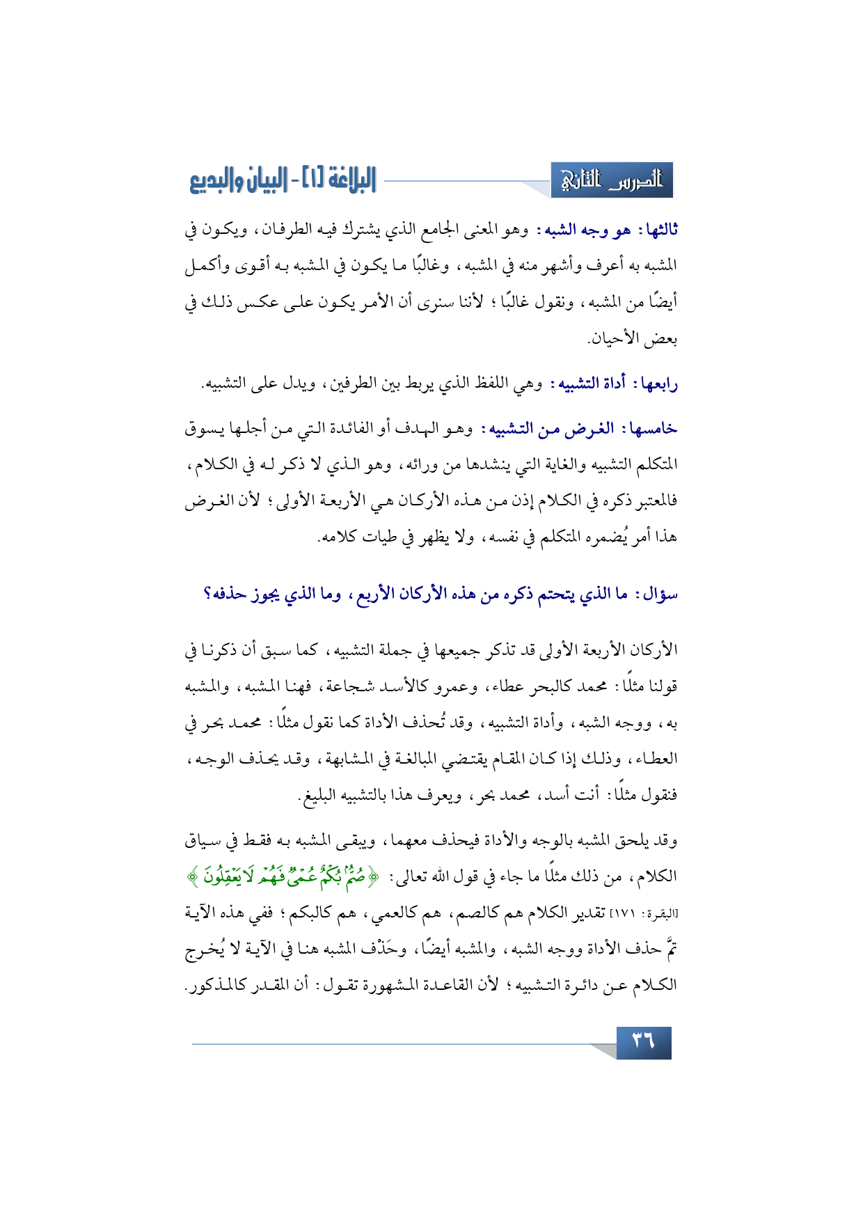 ثالثها: هو وجه الشبه، وهو المعنى الجامع الذي يشترك فيه الطرفان، ويكون في المشبه به أعرف وأشهر منه في المشبه، وغالبًا ما يكون في المشبه به أقوى وأكمل أيضًا من المشبه، ونقول غالبًا؛ لأننا سنرى أن الأمر يكون على عكس ذلك في بعض الأحيان.