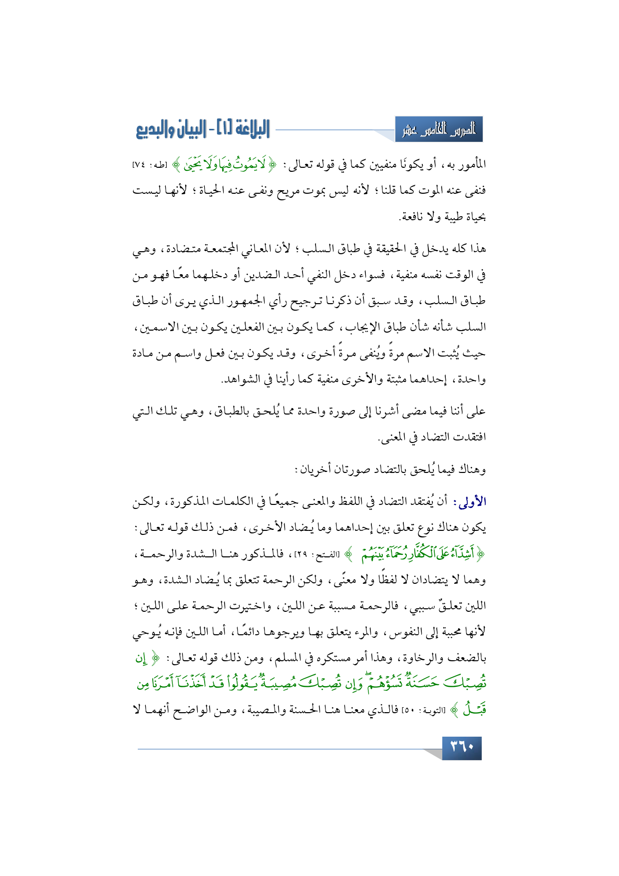 هذا كله يدخل في الحقيقة في طباق السلب؛ لأن المعاني المجتمعة متضادة، وهي في الوقت نفسه منفية، فسواء دخل النفي أحد الضدين أو دخلهما معًا فهو من طباق السلب، وقد سبق أن ذكرنا ترجيح رأي الجمهور الذي يرى أن طباق السلب شأنه شأن طباق الإيجاب، كما يكون بين الفعلين يكون بين الاسمين، حيث يُثبت الاسم مرةً ويُنفى مرةً أخرى، وقد يكون بين فعل واسم من مادة واحدة، إحداهما مثبتة والأخرى منفية كما رأينا في الشواهد.