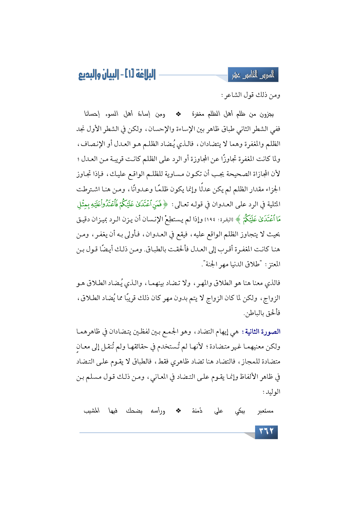 ففي الشطر الثاني طباق ظاهر بين الإساءة والإحسان، ولكن في الشطر الأول نجد الظلم والمغفرة وهما لا يتضادان، فالذي يُضاد الظلم هو العدل أو الإنصاف، ولما كانت المغفرة تجاوزًا عن المجاوزة أو الرد على الظلم كانت قريبة من العدل؛ لأن المجازاة الصحيحة يجب أن تكون مساوية للظلم الواقع عليك، فإذا تجاوز الجزاء مقدار الظلم لم يكن عدلًا وإنما يكون ظلمًا وعدوانًا، ومن هنا اشترطت المثلية في الرد على العدوان في قوله تعالى: {فَمَنِ اعْتَدَى عَلَيْكُمْ فَاعْتَدُوا عَلَيْهِ بِمِثْلِ مَا اعْتَدَى عَلَيْكُم} (البقرة: 194) وإذا لم يستطِعْ الإنسان أن يزن الرد بميزان دقيق بحيث لا يتجاوز الظلم الواقع عليه، فيقع في العدوان، فأولى به أن يغفر، ومن هنا كانت المغفرة أقرب إلى العدل فألحقت بالطباق. ومن ذلك أيضًا قول بن المعتز: "طلاق الدنيا مهر الجنة".