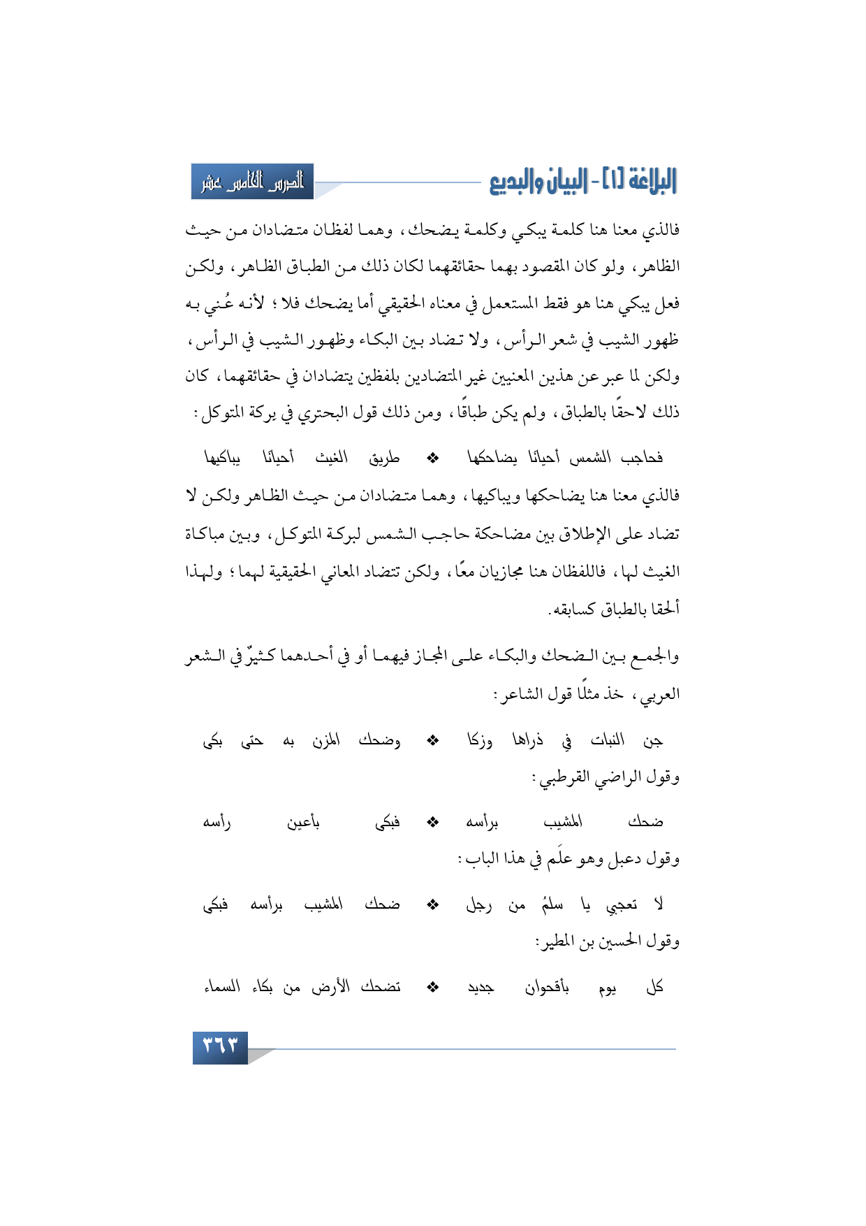 والجمع بين الضحك والبكاء على المجاز فيهما أو في أحدهما كثيرٌ في الشعر العربي، خذ مثلًا قول الشاعر: