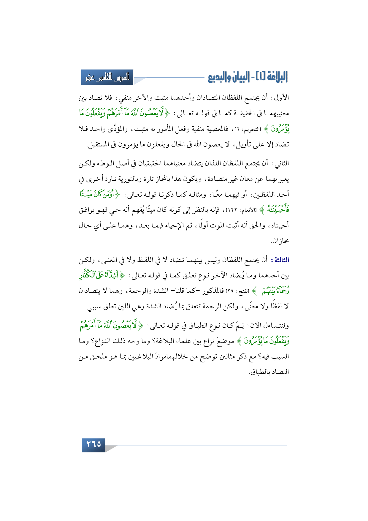 الأول: أن يجتمع اللفظان المتضادان وأحدهما مثبت والآخر منفي، فلا تضاد بين معنييهما في الحقيقة كما في قوله تعالى: {لَا يَعْصُونَ اللَّهَ مَا أَمَرَهُمْ وَيَفْعَلُونَ مَا يُؤْمَرُون} (التحريم: 6)، فالمعصية منفية وفعل المأمور به مثبت، والمؤدَّى واحد فلا تضاد إلا على تأويل، لا يعصون الله في الحال ويفعلون ما يؤمرون في المستقبل.