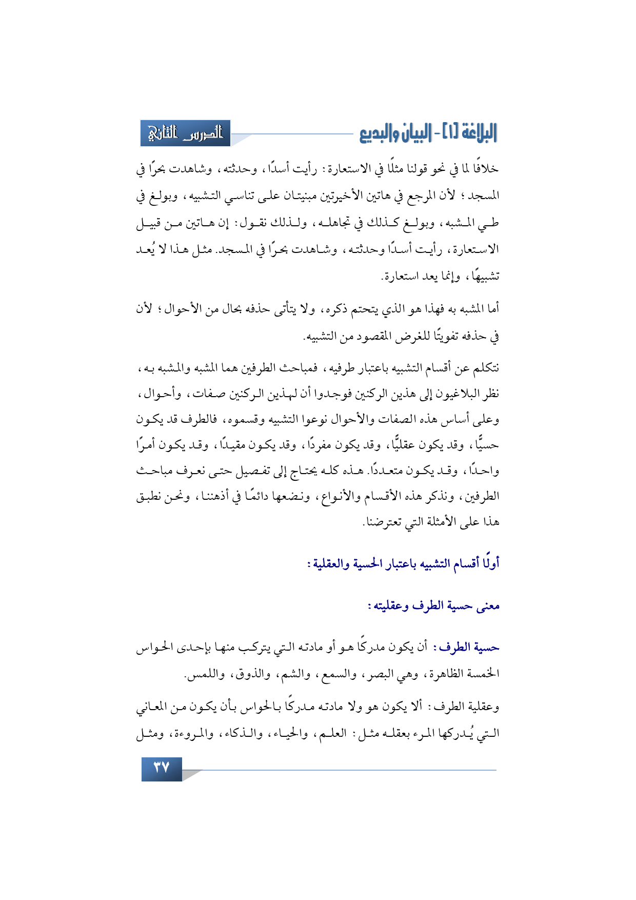 نتكلم عن أقسام التشبيه باعتبار طرفيه، فمباحث الطرفين هما المشبه والمشبه به، نظر البلاغيون إلى هذين الركنين فوجدوا أن لهذين الركنين صفات، وأحوال، وعلى أساس هذه الصفات والأحوال نوعوا التشبيه وقسموه، فالطرف قد يكون حسيًّا، وقد يكون عقليًّا، وقد يكون مفردًا، وقد يكون مقيدًا، وقد يكون أمرًا واحدًا، وقد يكون متعددًا. هذه كله يحتاج إلى تفصيل حتى نعرف مباحث الطرفين، ونذكر هذه الأقسام والأنواع، ونضعها دائمًا في أذهننا، ونحن نطبق هذا على الأمثلة التي تعترضنا.