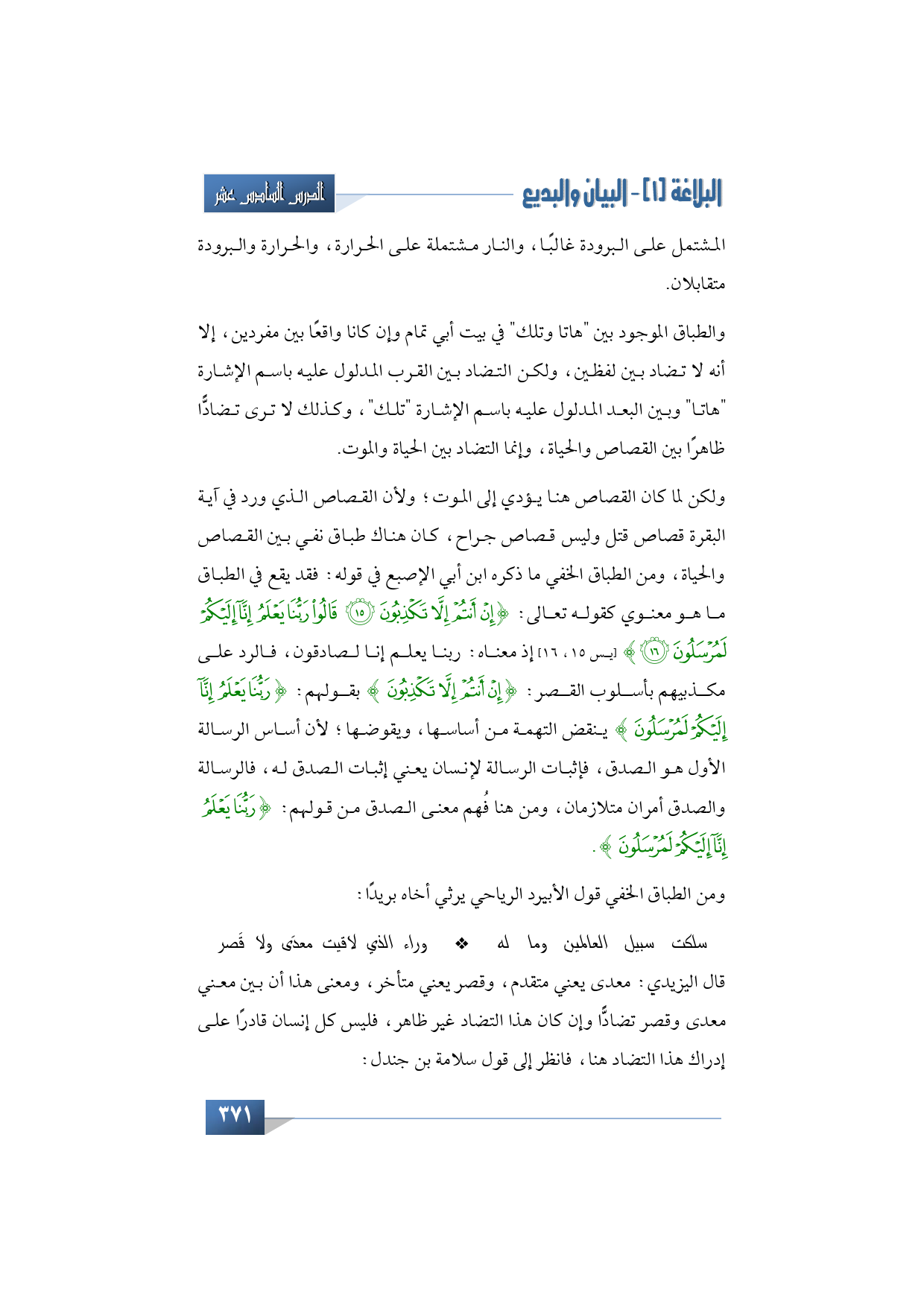 والطباق الموجود بين "هاتا وتلك" في بيت أبي تمام وإن كانا واقعًا بين مفردين، إلا أنه لا تضاد بين لفظين، ولكن التضاد بين القرب المدلول عليه باسم الإشارة "هاتا" وبين البعد المدلول عليه باسم الإشارة "تلك"، وكذلك لا ترى تضادًّا ظاهرًا بين القصاص والحياة، وإنما التضاد بين الحياة والموت.