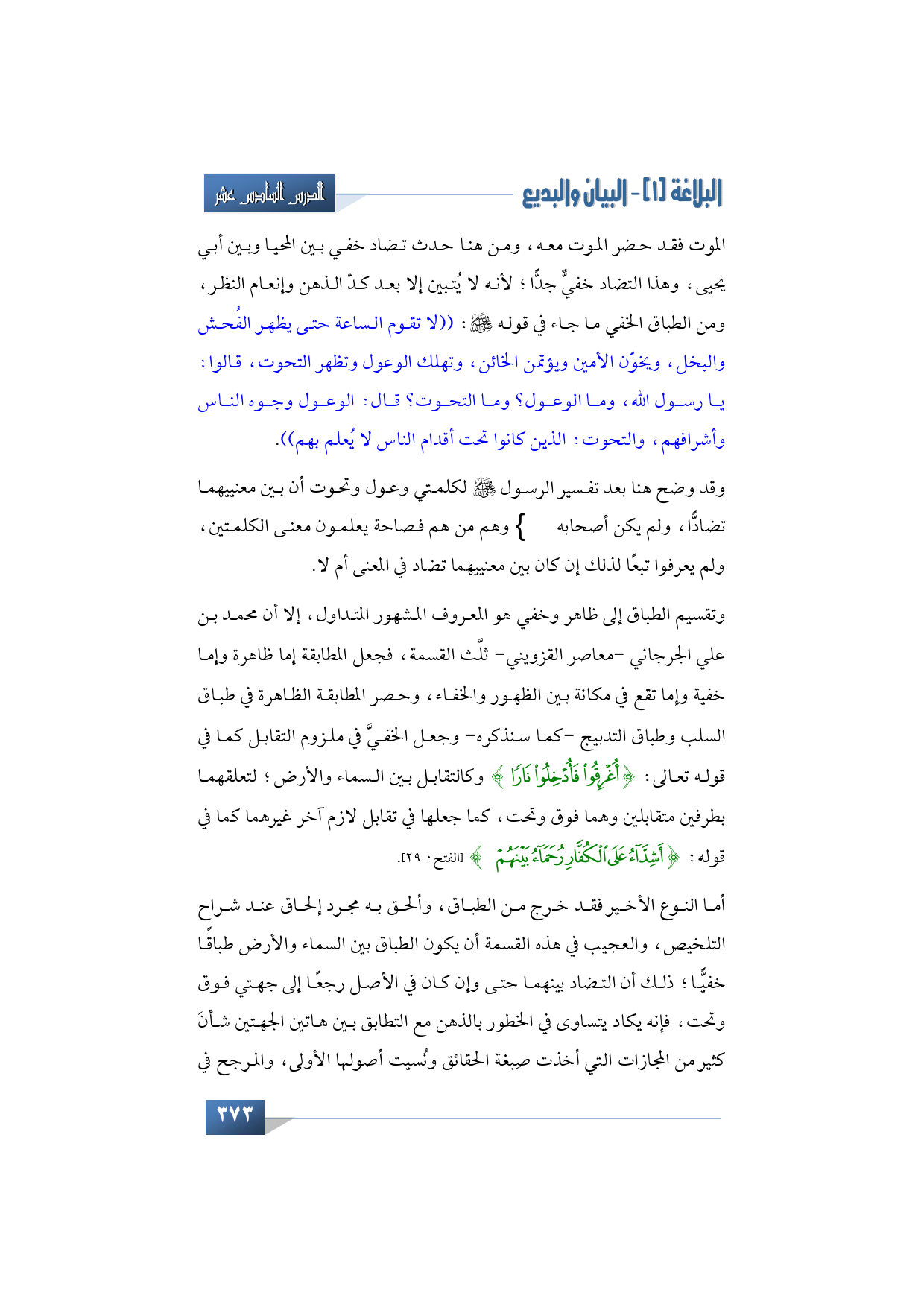الموت فقد حضر الموت معه، ومن هنا حدث تضاد خفي بين المحيا وبين أبي يحيى، وهذا التضاد خفيٌّ جدًّا؛ لأنه لا يُتبين إلا بعد كدّ الذهن وإنعام النظر، ومن الطباق الخفي ما جاء في قوله -صلى الله عليه وسلم-: ((لا تقوم الساعة حتى يظهر الفُحش والبخل، ويخوّن الأمين ويؤتمن الخائن، وتهلك الوعول وتظهر التحوت، قالوا: يا رسول الله، وما الوعول؟ وما التحوت؟ قال: الوعول وجوه الناس وأشرافهم، والتحوت: الذين كانوا تحت أقدام الناس لا يُعلم بهم)).