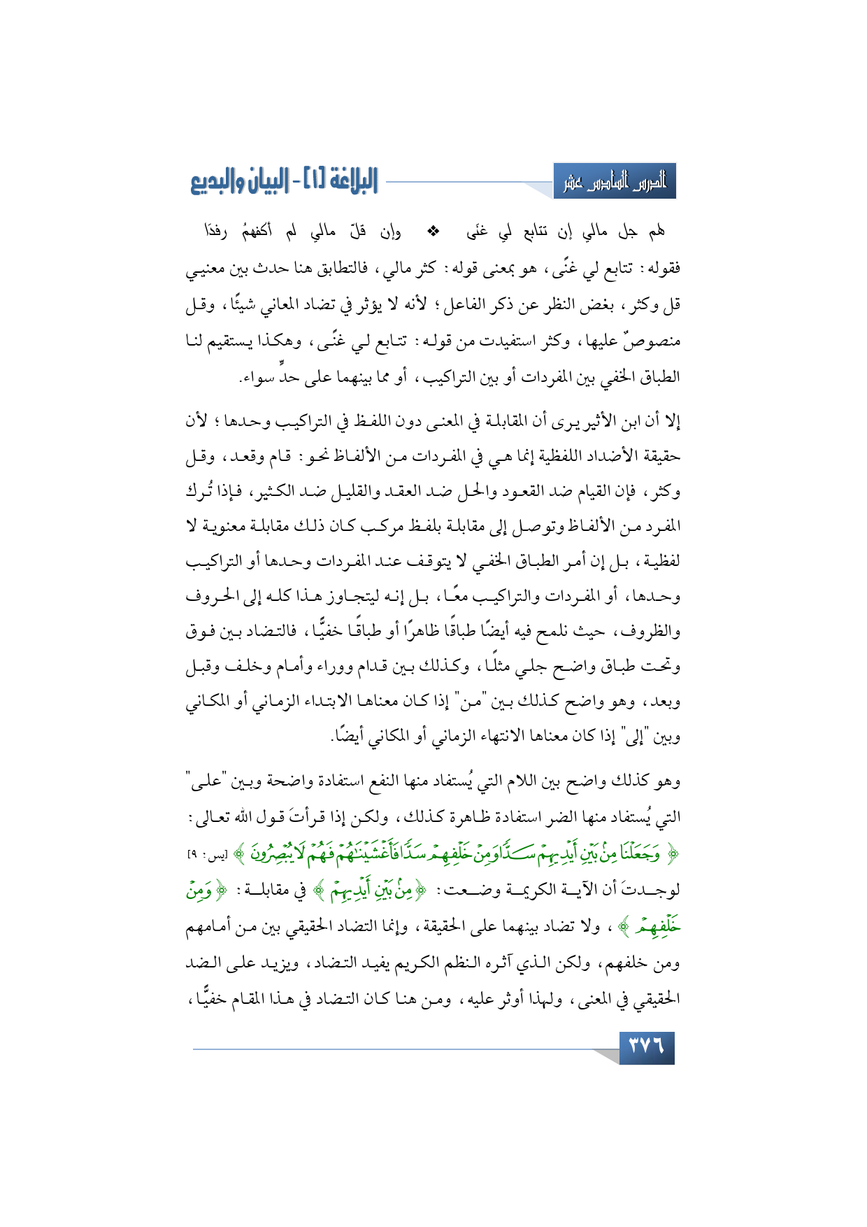 وهو كذلك واضح بين اللام التي يُستفاد منها النفع استفادة واضحة وبين "على" التي يُستفاد منها الضر استفادة ظاهرة كذلك، ولكن إذا قرأتَ قول الله تعالى: {وَجَعَلْنَا مِنْ بَيْنِ أَيْدِيهِمْ سَدًّا وَمِنْ خَلْفِهِمْ سَدًّا فَأَغْشَيْنَاهُمْ فَهُمْ لَا يُبْصِرُون} (يس: 9) لوجدتَ أن الآية الكريمة وضعت: {مِنْ بَيْنِ أَيْدِيهِمْ} في مقابلة: {مِنْ خَلْفِهِمْ}، ولا تضاد بينهما على الحقيقة، وإنما التضاد الحقيقي بين من أمامهم ومن خلفهم، ولكن الذي آثره النظم الكريم يفيد التضاد، ويزيد على الضد الحقيقي في المعنى، ولهذا أوثر عليه، ومن هنا كان التضاد في هذا المقام خفيًّا،