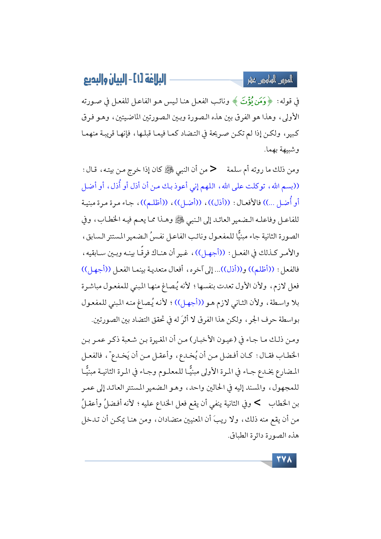 ومن ذلك ما روته أم سلمة -رضي الله عنها- من أن النبي -صلى الله عليه وسلم- كان إذا خرج من بيته، قال: ((بسم الله، توكلت على الله، اللهم إني أعوذ بك من أن أذل أو أُذل، أو أضل أو أُضل ... )) فالأفعال: ((أذل))، ((أضل))، ((أظلم))، جاء مرة مرة مبنية للفاعل وفاعله الضمير العائد إلى النبي -صلى الله عليه وسلم- وهذا مما يعم فيه الخطاب، وفي الصورة الثانية جاء مبنيًّا للمفعول ونائب الفاعل نفسُ الضمير المستتر السابق، والأمر كذلك في الفعل: ((أجهل))، غير أن هناك فرقًا بينه وبين سابقيه، فالفعل: ((أظلم)) و ((أذل)) ... إلى آخره، أفعال متعدية بينما الفعل ((أجهل)) فعل لازم، ولأن الأول تعدت بنفسها؛ لأنه يُصاغ منها المبني للمفعول مباشرة بلا واسطة، ولأن الثاني لازم هو ((أجهل))؛ لأنه يُصاغ منه المبني للمفعول بواسطة حرف الجر، ولكن هذا الفرق لا أثرَ له في تحقق التضاد بين الصورتين.