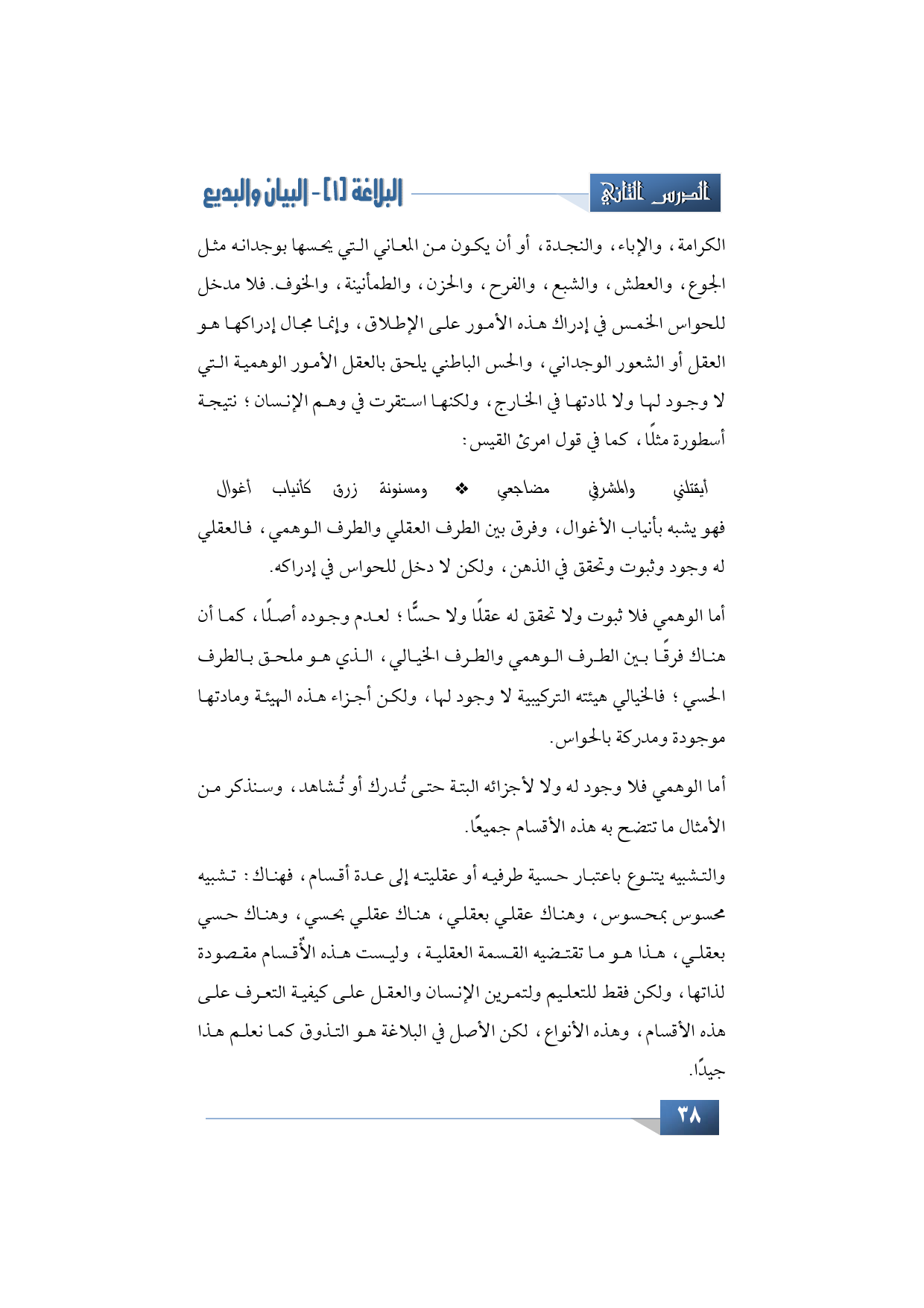 أما الوهمي فلا وجود له ولا لأجزائه البتة حتى تُدرك أو تُشاهد، وسنذكر من الأمثال ما تتضح به هذه الأقسام جميعًا. فعندنا مثلًا التشبيه يتنوع باعتبار حسية طرفيه أو عقليته إلى عدة أقسام، فهناك: تشبيه محسوس بمحسوس، وهناك عقلي بعقلي، هناك عقلي بحسي، وهناك حسي بعقلي، هذا هو ما تقتضيه القسمة العقلية.