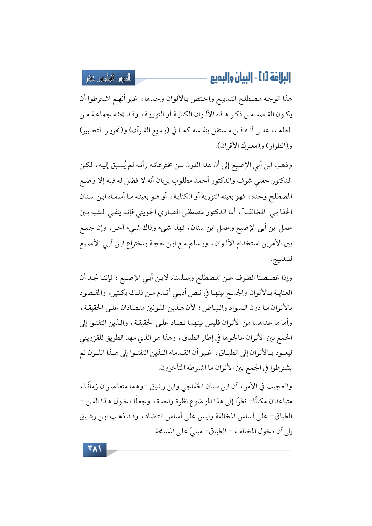 وإذا غضضنا الطرف عن المصطلح وسلمناه لابن أبي الإصبع؛ فإننا نجد أن العناية بالألوان والجمع بينها في نص أدبي أقدم من ذلك بكثير، والمقصود بالألوان ما دون السواد والبياض؛ لأن هذين اللونين متضادان على الحقيقة، وأما ما عداهما من الألوان فليس بينهما تضاد على الحقيقة، والذين التفتوا إلى الجمع بين الألوان عالجوها في إطار الطباق، وهذا هو الذي مهد الطريق للقزويني ليعود بالألوان إلى الطباق، غير أن القدماء الذين التفتوا إلى هذا اللون لم يشترطوا في الجمع بين الألوان ما اشترطه المتأخرون.