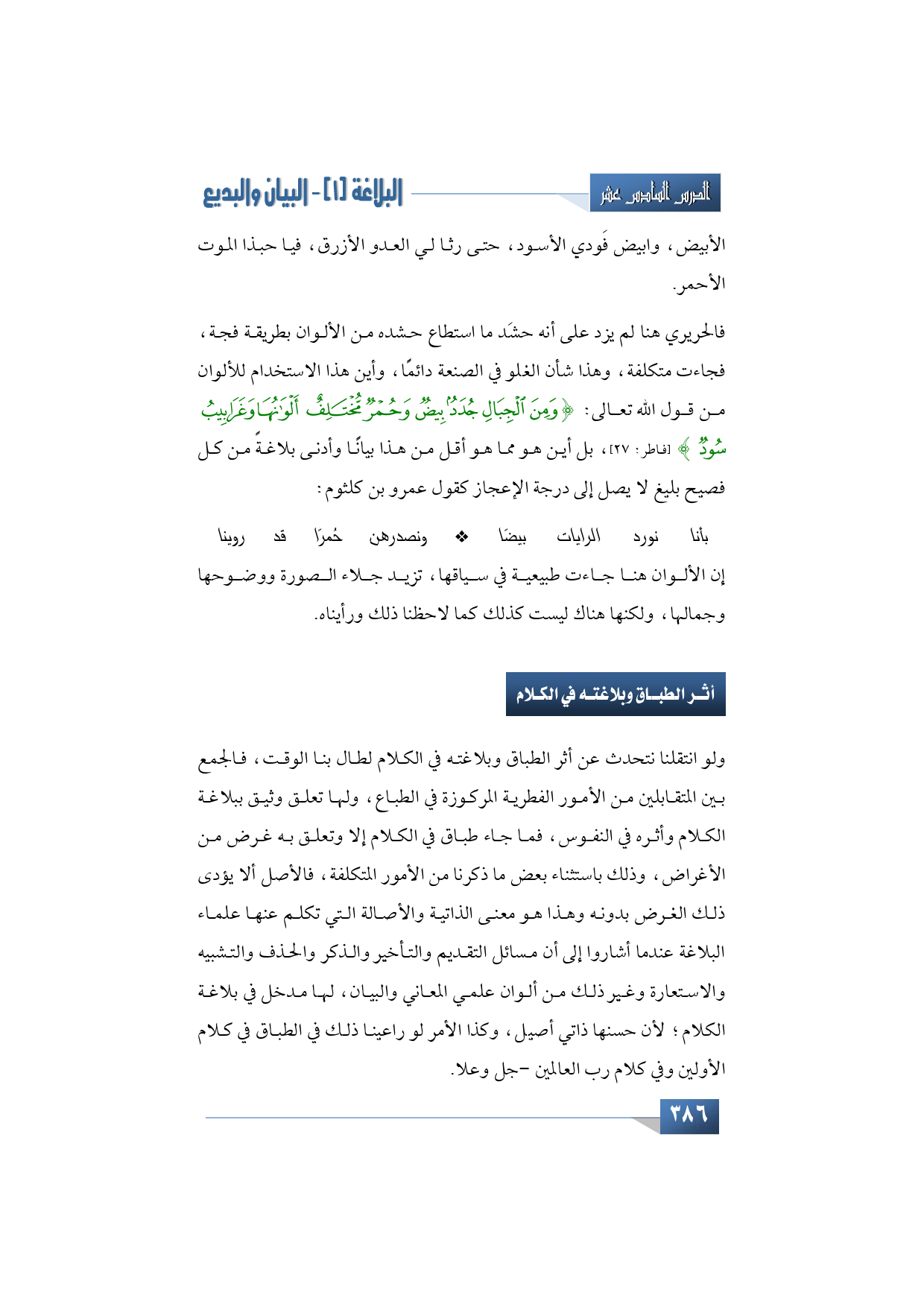 فالحريري هنا لم يزد على أنه حشَد ما استطاع حشده من الألوان بطريقة فجة، فجاءت متكلفة، وهذا شأن الغلو في الصنعة دائمًا، وأين هذا الاستخدام للألوان من قول الله تعالى: {وَمِنَ الْجِبَالِ جُدَدٌ بِيضٌ وَحُمْرٌ مُخْتَلِفٌ أَلْوَانُهَا وَغَرَابِيبُ سُود} (فاطر: 27)، بل أين هو مما هو أقل من هذا بيانًا وأدنى بلاغةً من كل فصيح بليغ لا يصل إلى درجة الإعجاز كقول عمرو بن كلثوم: