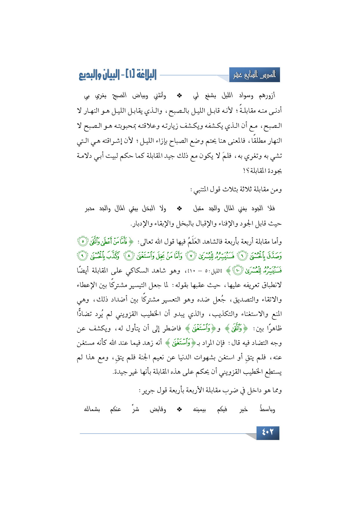 وأما مقابلة أربعة بأربعة فالشاهد العَلَمُ فيها قول الله تعالى: {فَأَمَّا مَنْ أَعْطَى وَاتَّقَى * وَصَدَّقَ بِالْحُسْنَى * فَسَنُيَسِّرُهُ لِلْيُسْرَى * وَأَمَّا مَنْ بَخِلَ وَاسْتَغْنَى * وَكَذَّبَ بِالْحُسْنَى * فَسَنُيَسِّرُهُ لِلْعُسْرَى} (الليل:5 - 10)، وهو شاهد السكاكي على المقابلة أيضًا لانطباق تعريفه عليها، حيث عقبها بقوله: لما جعل التيسير مشتركًا بين الإعطاء والاتقاء والتصديق، جُعل ضده وهو التعسير مشتركًا بين أضداد ذلك، وهي المنع والاستغناء والتكذيب، والذي يبدو أن الخطيب القزويني لم يُرد تضادًّا ظاهرًا بين: {اتَّقَى} و {اسْتَغْنَى} فاضطر إلى أن يتأول له، ويكشف عن وجه التضاد فيه قال: فإن المراد بـ {اسْتَغْنَى} أنه زهد فيما عند الله كأنه مستغن عنه، فلم يتقِ أو استغن بشهوات الدنيا عن نعيم الجنة فلم يتقِ، ومع هذا لم يستطِع الخطيب القزويني أن يحكم على هذه المقابلة بأنها غير جيدة.