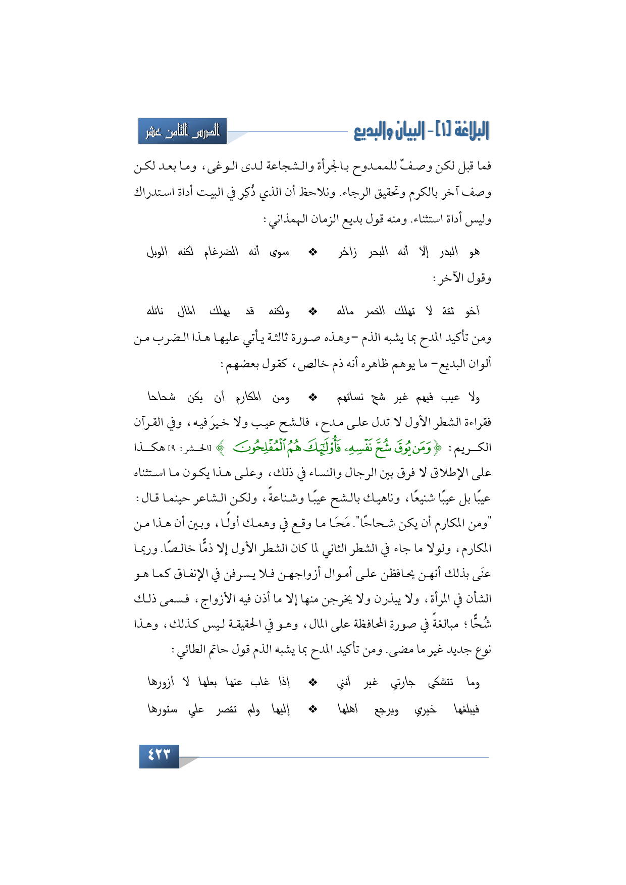 فقراءة الشطر الأول لا تدل على مدح، فالشح عيب ولا خيرَ فيه، وفي القرآن الكريم: {وَمَنْ يُوقَ شُحَّ نَفْسِهِ فَأُولَئِكَ هُمُ الْمُفْلِحُونَ} (الحشر: 9) هكذا على الإطلاق لا فرق بين الرجال والنساء في ذلك، وعلى هذا يكون ما استثناه عيبًا بل عيبًا شنيعًا، وناهيك بالشح عيبًا وشناعةً، ولكن الشاعر حينما قال: "ومن المكارم أن يكن شحاحًا". مَحَا ما وقع في وهمك أولًا، وبين أن هذا من المكارم، ولولا ما جاء في الشطر الثاني لما كان الشطر الأول إلا ذمًّا خالصًا. وربما عنَى بذلك أنهن يحافظن على أموال أزواجهن فلا يسرفن في الإنفاق كما هو الشأن في المرأة، ولا يبذرن ولا يخرجن منها إلا ما أذن فيه الأزواج، فسمى ذلك شُحًّا؛ مبالغةً في صورة المحافظة على المال، وهو في الحقيقة ليس كذلك، وهذا نوع جديد غير ما مضى. ومن تأكيد المدح بما يشبه الذم قول حاتم الطائي: