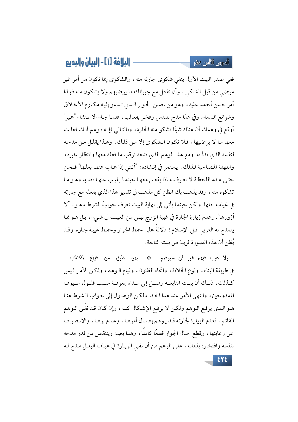 في طريقة البِناء، ونوع الخَلابة، واتجاه الظنون، وقيام الوهم، ولكن الأمر ليس كذلك، ذلك أن بيت النابغة وصل إلى مداه بمعرفة سبب فلول سيوف الممدوحين، وانتهى الأمر عند هذا الحد. ولكن الوصول إلى جواب الشرط هنا هو الذي يرفع الوهم ولكن لا يرفع الإشكال كله، وإن كان قد نفَى الوهم القائم، فعدم الزيارة لجارته قد يوهم إهمال أمرها، وعدم برها، والانصراف عن رعايتها، وقطع حبال الجوار قطعًا كاملًا، وهذا يعيبه وينتقص من قدر مدحه لنفسه وافتخاره بفعاله، على الرغم من أن نفي الزيارة في غياب البعل مدح له