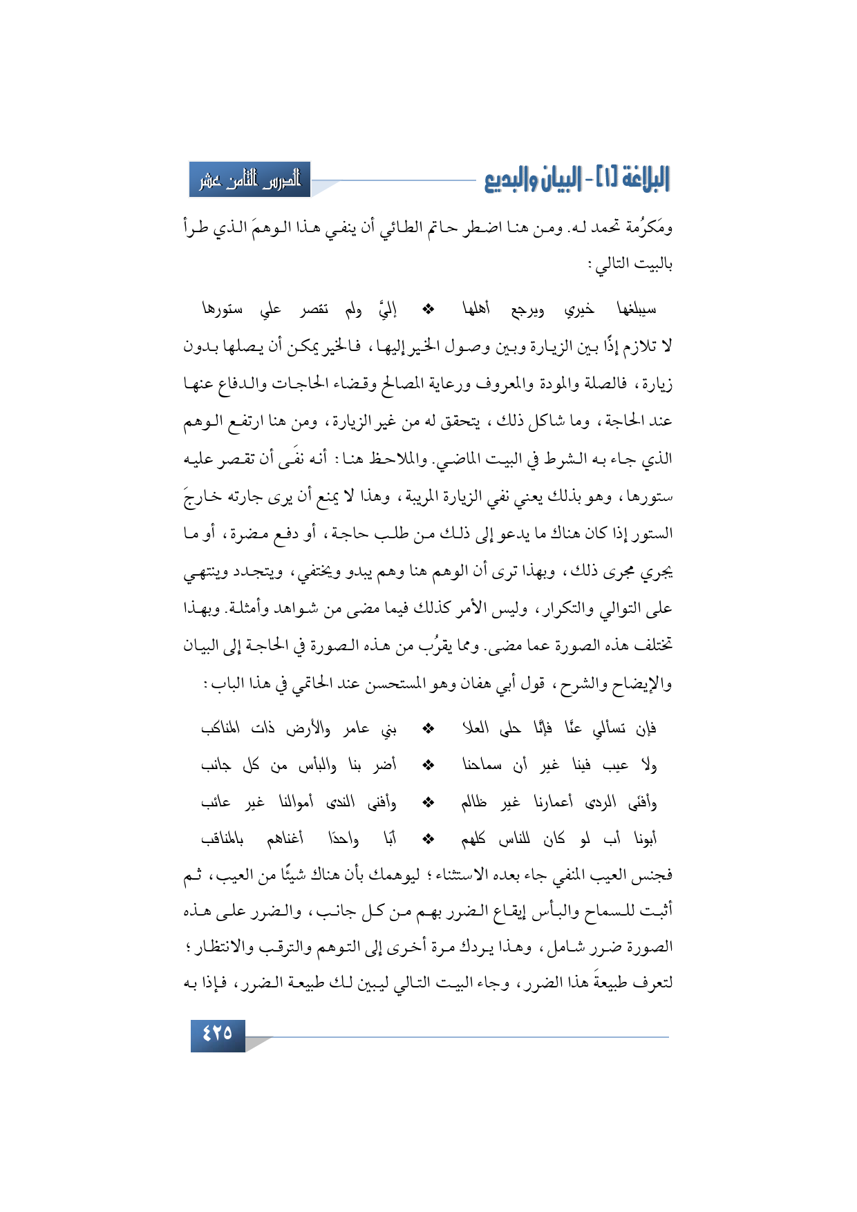 لا تلازم إذًا بين الزيارة وبين وصول الخير إليها، فالخير يمكن أن يصلها بدون زيارة، فالصلة والمودة والمعروف ورعاية المصالح وقضاء الحاجات والدفاع عنها عند الحاجة، وما شاكل ذلك، يتحقق له من غير الزيارة، ومن هنا ارتفع الوهم الذي جاء به الشرط في البيت الماضي. والملاحظ هنا: أنه نفَى أن تقصر عليه ستورها، وهو بذلك يعني نفي الزيارة المريبة، وهذا لا يمنع أن يرى جارته خارجَ الستور إذا كان هناك ما يدعو إلى ذلك من طلب حاجة، أو دفع مضرة، أو ما يجري مجرى ذلك، وبهذا ترى أن الوهم هنا وهم يبدو ويختفي، ويتجدد وينتهي على التوالي والتكرار، وليس الأمر كذلك فيما مضى من شواهد وأمثلة. وبهذا تختلف هذه الصورة عما مضى. ومما يقرُب من هذه الصورة في الحاجة إلى البيان والإيضاح والشرح، قول أبي هفان وهو المستحسن عند الحاتمي في هذا الباب: