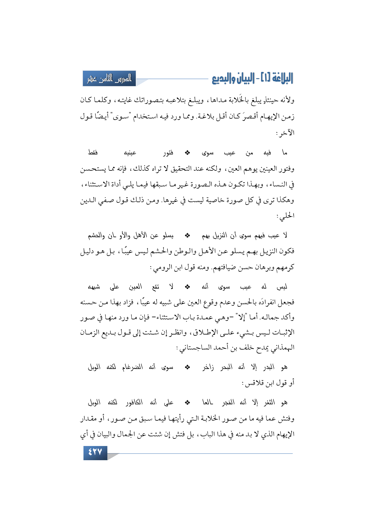 ولكنه عند التحقيق لا تراه كذلك، فإنه مما يستحسن في النساء، وبهذا تكون هذه الصورة غير ما سبقها فيما يلي أداة الاستثناء، وهكذا ترى في كل صورة خاصية ليست في غيرها. ومن ذلك قول صفي الدين الحلي: