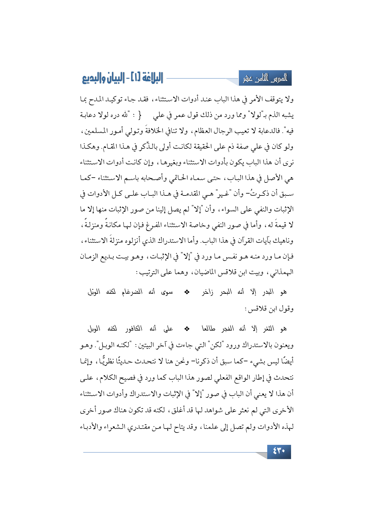 ويعنون بالاستدراك ورود "لكن" التي جاءت في آخر البيتين: "لكنه الوبل". وهو أيضًا ليس بشيء -كما سبق أن ذكرنا- ونحن هنا لا نتحدث حديثًا نظريًّا، وإنما نتحدث في إطار الواقع الفعلي لصور هذا الباب كما ورد في فصيح الكلام، على أن هذا لا يعني أن الباب في صور "إلا" في الإثبات والاستدراك وأدوات الاستثناء الأخرى التي لم نعثر على شواهد لها قد أغلق، لكنه قد تكون هناك صور أخرى لهذه الأدوات ولم تصل إلى علمنا، وقد يتاح لها من مقتدري الشعراء والأدباء
