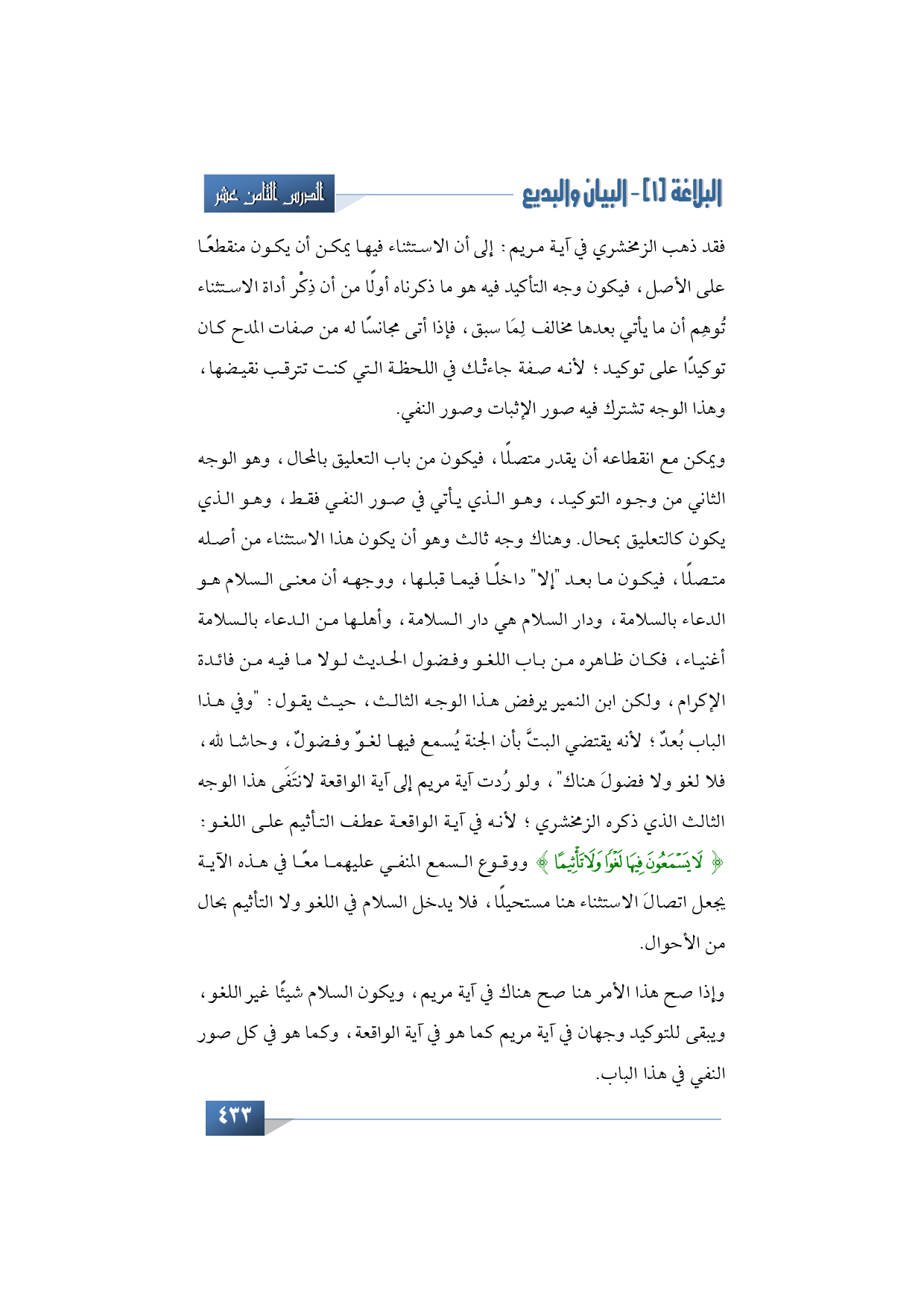 ويمكن مع انقطاعه أن يقدر متصلًا، فيكون من باب التعليق بالمحال، وهو الوجه الثاني من وجوه التوكيد، وهو الذي يأتي في صور النفي فقط، وهو الذي يكون كالتعليق بمحال. وهناك وجه ثالث وهو أن يكون هذا الاستثناء من أصله متصلًا، فيكون ما بعد "إلا" داخلًا فيما قبلها، ووجهه أن معنى السلام هو الدعاء بالسلامة، ودار السلام هي دار السلامة، وأهلها من الدعاء بالسلامة أغنياء، فكان ظاهره من باب اللغو وفضول الحديث لولا ما فيه من فائدة الإكرام، ولكن ابن النمير يرفض هذا الوجه الثالث، حيث يقول: "وفي هذا الباب بُعدٌ؛ لأنه يقتضي البتَّ بأن الجنة يُسمع فيها لغوٌ وفضولٌ، وحاشا لله، فلا لغو ولا فضولَ هناك"، ولو رُدت آية مريم إلى آية الواقعة لانتَفَى هذا الوجه الثالث الذي ذكره الزمخشري؛ لأنه في آية الواقعة عطف التأثيم على اللغو: {لَا يَسْمَعُونَ فِيهَا لَغْوًا وَلَا تَأْثِيمًا} ووقوع السمع المنفي عليهما معًا في هذه الآية يجعل اتصالَ الاستثناء هنا مستحيلًا، فلا يدخل السلام في اللغو ولا التأثيم بحال من الأحوال. وإذا صح هذا الأمر هنا صح هناك في آية مريم، ويكون السلام شيئًا غير اللغو، ويبقى للتوكيد وجهان في آية مريم كما هو في آية الواقعة، وكما هو في كل صور النفي في هذا الباب.