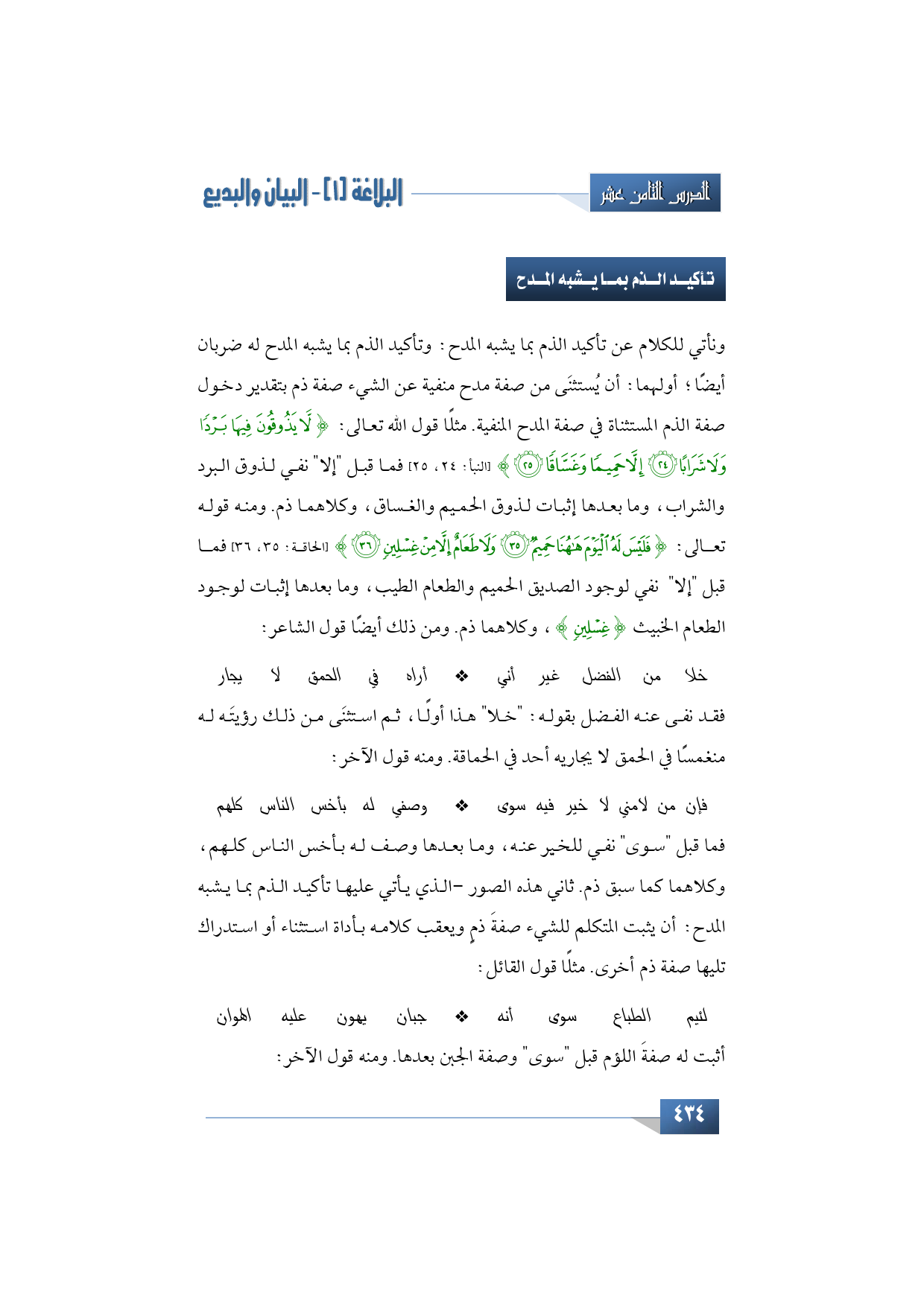 ونأتي للكلام عن تأكيد الذم بما يشبه المدح: وتأكيد الذم بما يشبه المدح له ضربان أيضًا؛ أولهما: أن يُستثنَى من صفة مدح منفية عن الشيء صفة ذم بتقدير دخول صفة الذم المستثناة في صفة المدح المنفية. مثلًا قول الله تعالى: {لَا يَذُوقُونَ فِيهَا بَرْدًا وَلَا شَرَابًا * إِلَّا حَمِيمًا وَغَسَّاقًا} (النبأ: 24، 25) فما قبل "إلا" نفي لذوق البرد والشراب، وما بعدها إثبات لذوق الحميم والغساق، وكلاهما ذم. ومنه قوله تعالى: {فَلَيْسَ لَهُ الْيَوْمَ هَا هُنَا حَمِيمٌ *وَلَا طَعَامٌ إِلَّا مِنْ غِسْلِينٍ} (الحاقة: 35، 36) فما قبل "إلا" نفي لوجود الصديق الحميم والطعام الطيب، وما بعدها إثبات لوجود الطعام الخبيث {غِسْلِينٍ}، وكلاهما ذم. ومن ذلك أيضًا قول الشاعر:
