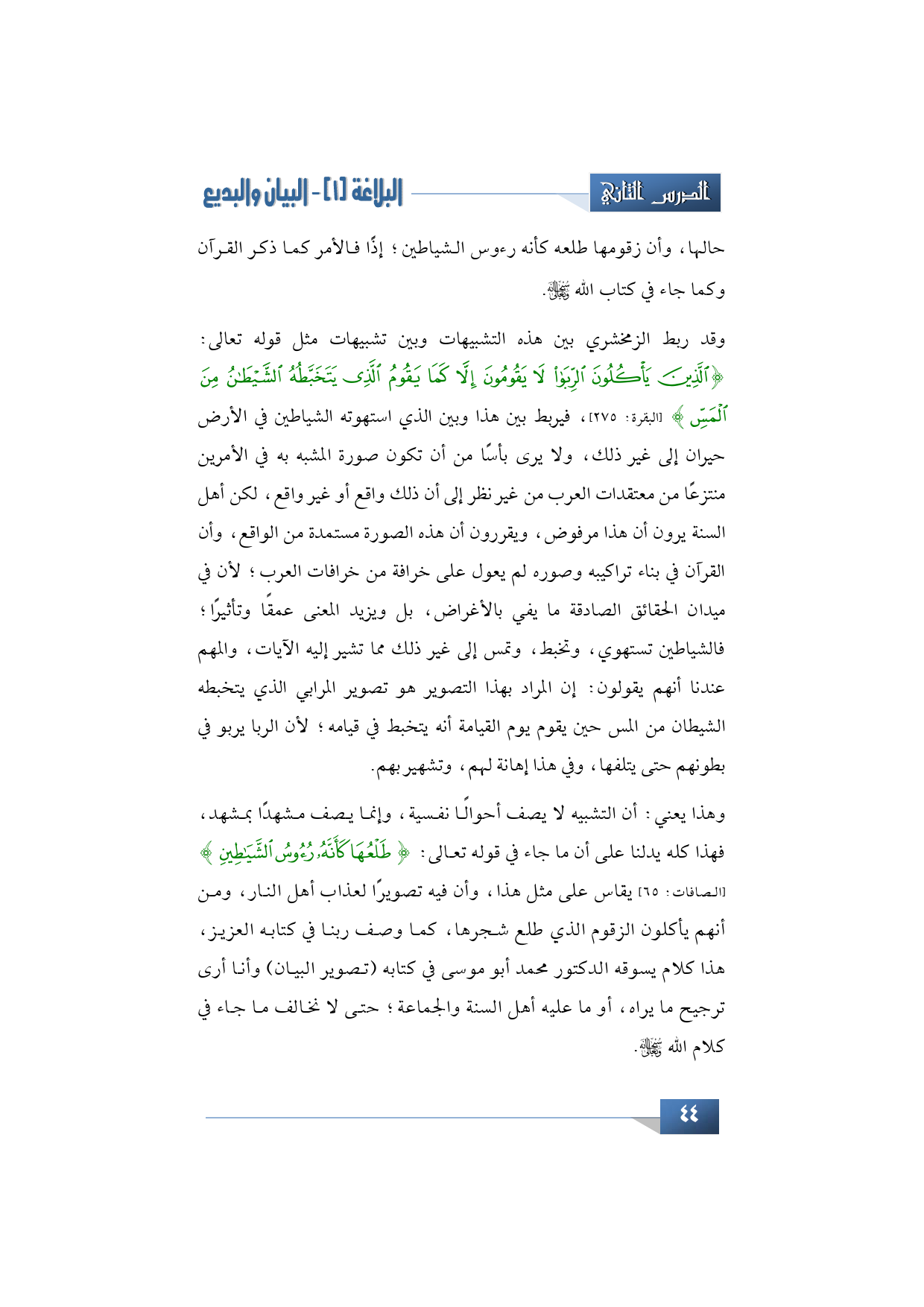 حالها، وأن زقومها طلعه كأنه رءوس الشياطين. إذن فالأمر كما ذكر القرآن وكما جاء في كتاب الله -سبحانه وتعالى، طبعًا الزمخشري يربط بين هذه التشبيهات وبين تشبيهات مثل قوله تعالى: {الَّذِينَ يَأْكُلُونَ الرِّبَا لَا يَقُومُونَ إِلَّا كَمَا يَقُومُ الَّذِي يَتَخَبَّطُهُ الشَّيْطَانُ مِنَ الْمَسِّ} (البقرة: 275)، فيربط بين هذا وبين الذي استهوته الشياطين في الأرض حيران إلى غير ذلك، ولا يرى بأسًا من أن تكون صورة المشبه به في الأمرين منتزعًا من معتقدات العرب من غير نظر إلى أن ذلك واقع، أو غير واقع، لكن أهل السنة يرون أن هذا مرفوض، ويقررون أن هذه الصورة مستمدة من الواقع، وأن القرآن في بناء تراكيبه وصوره لم يعول على خرافة من خرافات العرب؛ لأن في ميدان الحقائق الصادقة ما يفي بالأغراض، بل ويزيد المعنى عمقًا وتأثيرًا؛ فالشياطين تستهوي، وتخبط، وتمس إلى غير ذلك مما تشير إليه الآيات، والمهم عندنا أنهم يقولون: إن المراد بهذا التصوير، هو تصوير المرابي الذي يتخبطه الشيطان من المس حين يقوم يوم القيامة أنه يتخبط في قيامه؛ لأن الربا يربو في بطونهم حتى يتلفها، وفي هذا إهانة لهم، وتشهير بهم.