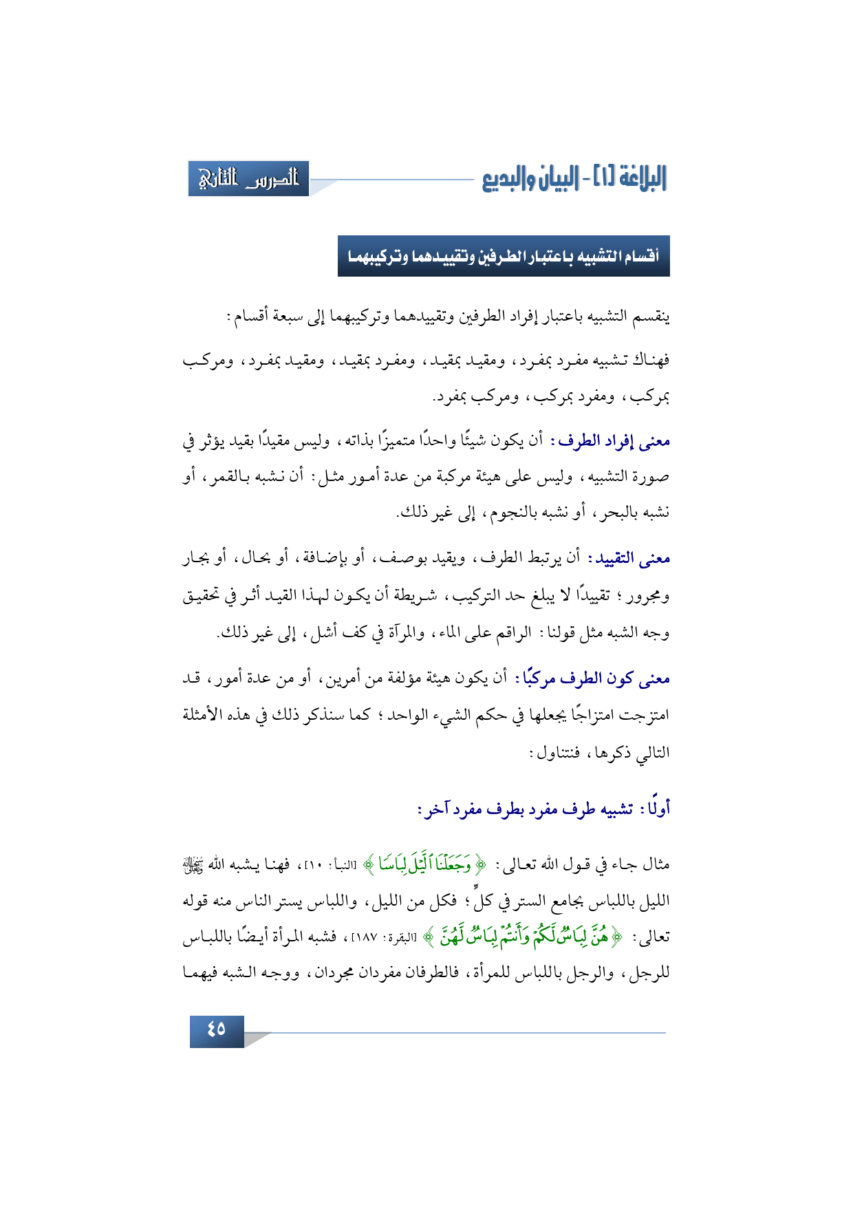 أولًا معنى أن يتشبه طرف مفرد بطرف مفرد آخر، نذكر مثلًا من الأمثلة ما جاء في قول الله تعالى: {وَجَعَلْنَا اللَّيْلَ لِبَاسًا} (النبأ: 10)، فهنا يشبه الله -سبحانه وتعالى- الليل باللباس بجامع الستر في كل فكل من الليل، واللباس يستر الناس منه قوله تعالى: {هُنَّ لِبَاسٌ لَكُمْ وَأَنْتُمْ لِبَاسٌ لَهُنَّ} (البقرة: 187)، فشبه المرأة أيضًا باللباس للرجل، والرجل باللباس للمرأة، فالطرفان مفردان مجردان، وجه الشبه فيما