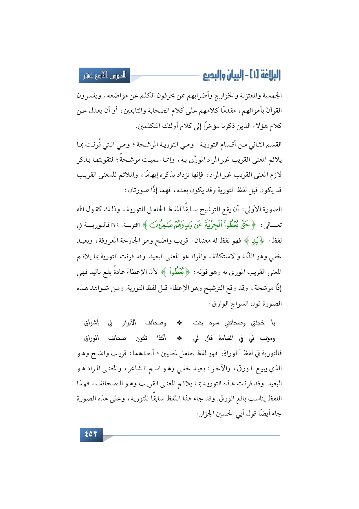 الصورة الأولى: أن يقع الترشيح سابقًا للفظ الحامل للتورية، وذلك كقول الله تعالى: {حَتَّى يُعْطُوا الْجِزْيَةَ عَنْ يَدٍ وَهُمْ صَاغِرُونَ} (التوبة: 29) فالتورية في لفظ: {يَدٍ} فهو لفظ له معنيان: قريب واضح وهو الجارحة المعروفة، وبعيد خفي وهو الذِّلة والاستكانة، والمراد هو المعنى البعيد. وقد قرنت التورية بما يلائم المعنى القريب المورى به وهو قوله: {يُعْطُوا} لأن الإعطاءَ عادةً يقع باليد فهي إذًا مرشحة، وقد وقع الترشيح وهو الإعطاء قبل لفظ التورية. ومن شواهد هذه الصورة قول السراج الوارق: