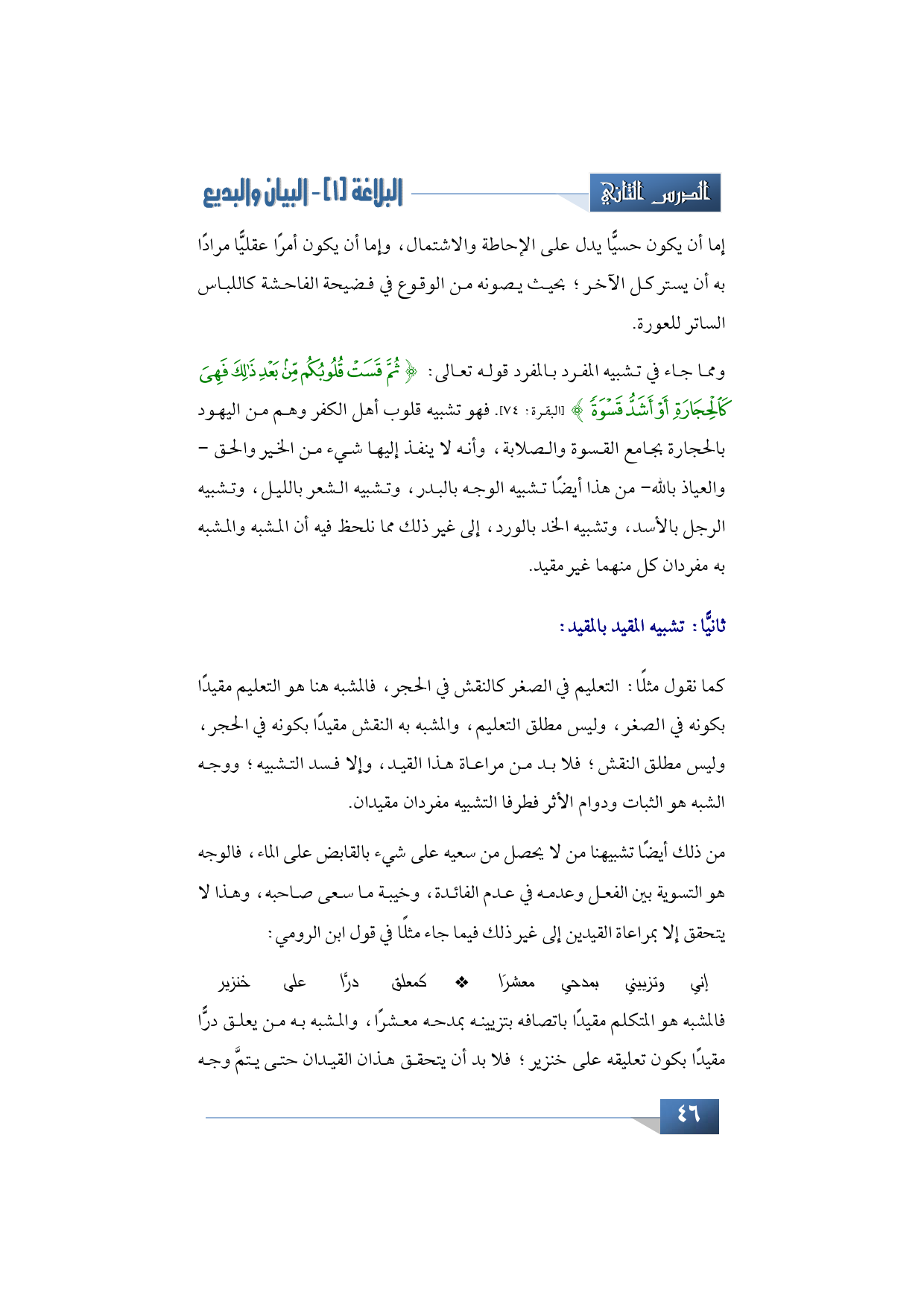 إما أن يكون حسيًّا يدل على الإحاطة والاشتمال، وإما أن يكون أمرًا عقليًّا مراد به أن يستر كل الآخر؛ بحيث يصونه من الوقوع في فضيحة الفاحشة كاللباس الساتر للعورة، مما جاء في تشبيه المفرد بالمفرد قوله تعالى: {ثُمَّ قَسَتْ قُلُوبُكُمْ مِنْ بَعْدِ ذَلِكَ فَهِيَ كَالْحِجَارَةِ أَوْ أَشَدُّ قَسْوَةً} (البقرة: 74). فهو تشبيه قلوب أهل الكفر وهم من اليهود بالحجارة بجامع القسوة والصلابة، وأنه لا ينفذ إليها شيء من الخير، والحق -والعياذ بالله- من هذا أيضًا تشبيه الوجه بالبدر، تشبيه الشعر بالليل، تشبيه الرجل بالأسد، وتشبيه الخد بالورد، إلى غير ذلك مما نلحظ فيه أن المشبه والمشبه به مفردان كل منهما غير مقيد.
