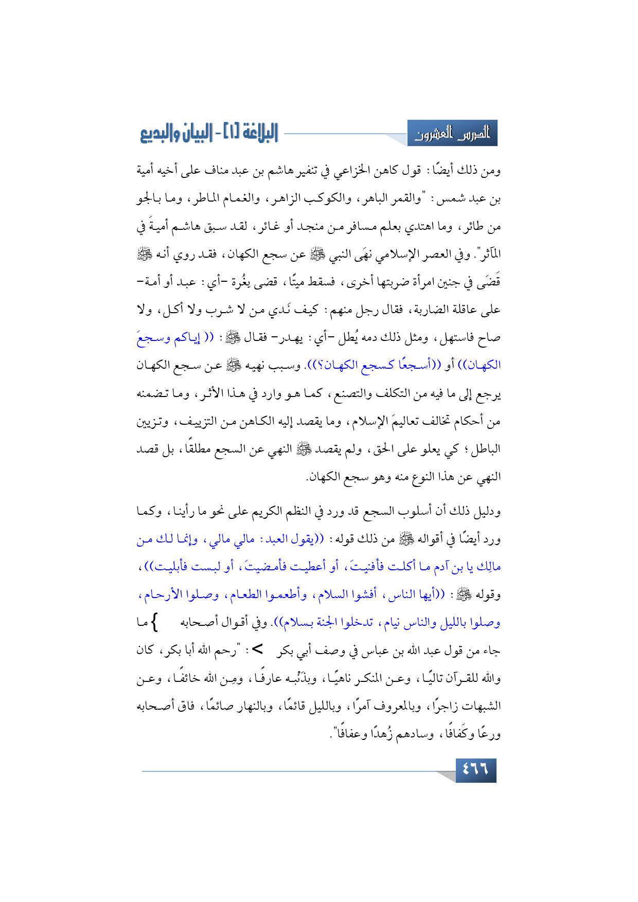 ومن ذلك أيضًا: قول كاهن الخزاعي في تنفير هاشم بن عبد مناف على أخيه أمية بن عبد شمس: "والقمر الباهر، والكوكب الزاهر، والغمام الماطر، وما بالجو من طائر، وما اهتدي بعلم مسافر من منجد أو غائر، لقد سبق هاشم أميةَ في المآثر". وفي العصر الإسلامي نهَى النبي -صلى الله عليه وسلم- عن سجع الكهان، فقد روي أنه -عليه الصلاة والسلام- قَضَى في جنين امرأة ضربتها أخرى، فسقط ميتًا، قضى بِغُرة -أي: عبد أو أمة- على عاقلة الضاربة، فقال رجل منهم: كيف نَدي من لا شرب ولا أكل، ولا صاح فاستهل، ومثل ذلك دمه يُطل -أي: يهدر- فقال -صلى الله عليه وسلم: ((إياكم وسجعَ الكهان)) أو ((أسجعًا كسجع الكهان؟)). وسبب نهيه -عليه الصلاة والسلام- عن سجع الكهان يرجع إلى ما فيه من التكلف والتصنع، كما هو وارد في هذا الأثر، وما تضمنه من أحكام تخالف تعاليمَ الإسلام، وما يقصد إليه الكاهن من التزييف، وتزيين الباطل؛ كي يعلو على الحق، ولم يقصد -صلى الله عليه وسلم- النهي عن السجع مطلقًا، بل قصد النهي عن هذا النوع منه وهو سجع الكهان.