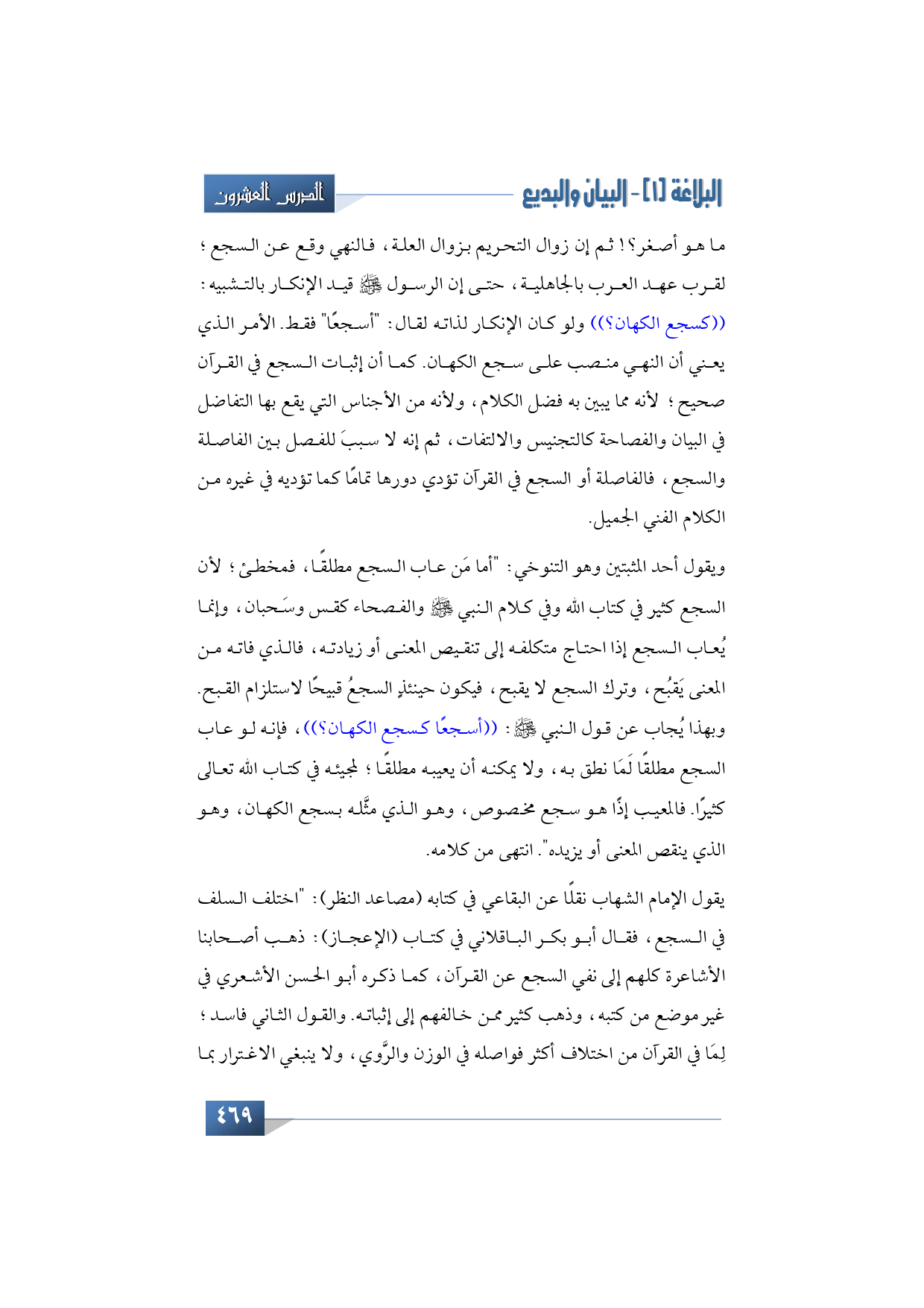 ما هو أصغر؟! ثم إن زوال التحريم بزوال العلة، فالنهي وقع عن السجع؛ لقرب عهد العرب بالجاهلية، حتى إن الرسول -صلى الله عليه وسلم- قيد الإنكار بالتشبيه: ((كسجع الكهان؟)) ولو كان الإنكار لذاته لقال: "أسجعًا" فقط. الأمر الذي يعني أن النهي منصب على سجع الكهان. كما أن إثبات السجع في القرآن صحيح؛ لأنه مما يبين به فضل الكلام، ولأنه من الأجناس التي يقع بها التفاضل في البيان والفصاحة كالتجنيس والالتفات، ثم إنه لا سببَ للفصل بين الفاصلة والسجع، فالفاصلة أو السجع في القرآن تؤدي دورها تمامًا كما تؤديه في غيره من الكلام الفني الجميل.