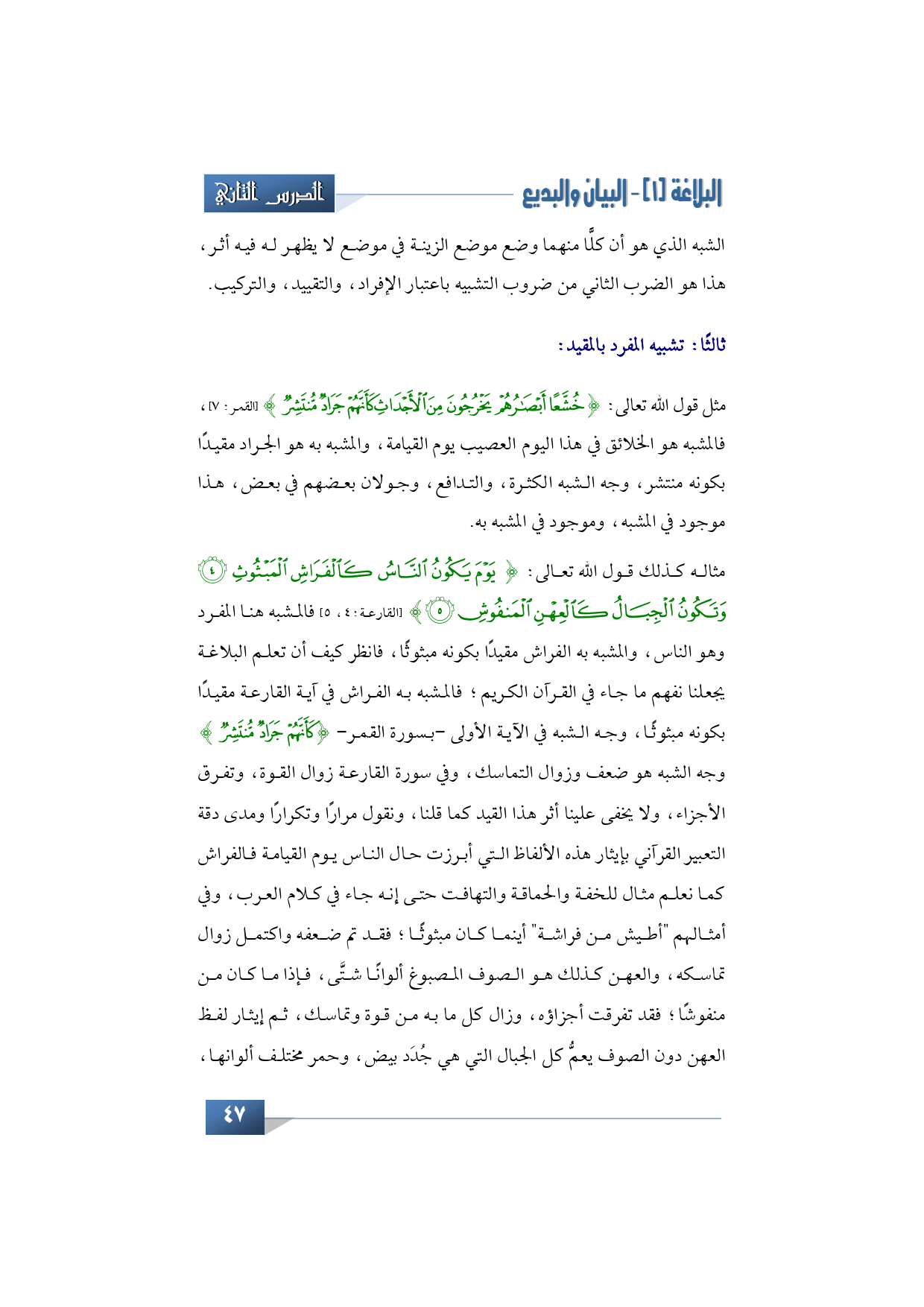 مثاله كذلك قول الله تعالى: {يَوْمَ يَكُونُ النَّاسُ كَالْفَرَاشِ الْمَبْثُوثِ وَتَكُونُ الْجِبَالُ كَالْعِهْنِ الْمَنْفُوشِ} (القارعة: 5، 6) فالمشبه هنا المفرد وهو الناس، والمشبه به الفراش مقيدًا بكونه مبثوثًا، فانظر كيف أن تعلم البلاغة يجعلنا نفهم ما جاء في القرآن الكريم، يعني: لو أن واحدًا جاء مثلًا، وقال: كأنهم جراد منتشر، وأن الله شبههم بالجراد فقط، وانتهى الأمر على هذا، أو قال: بأن الناس يكون يوم القيامة كالفراش دون أن يذكر كلمة المبثوث، أو يراعي هذا القيد نقول: إن هذا التشبيه ناقص، فلا بد من وجود هذه القيود، ولا بد من مراعاتها.
